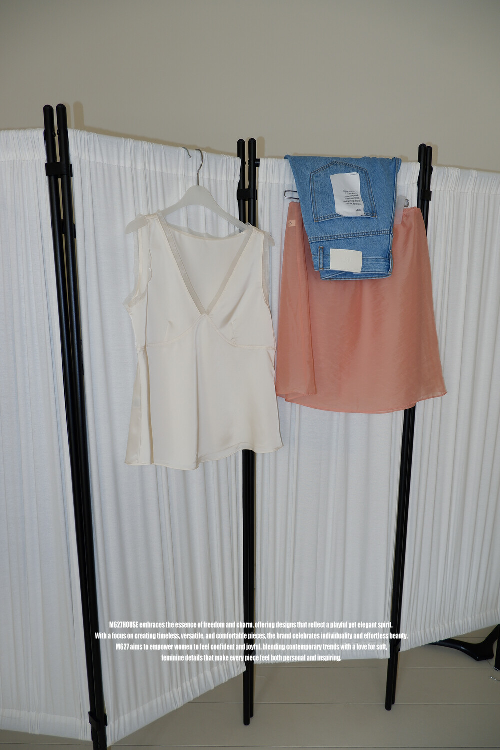 PRODUCT INFO ――――――――――――――――――――――――――――――――― 쉬어한 오간자 소재 배색 디자인의 슬리브리스 탑.
