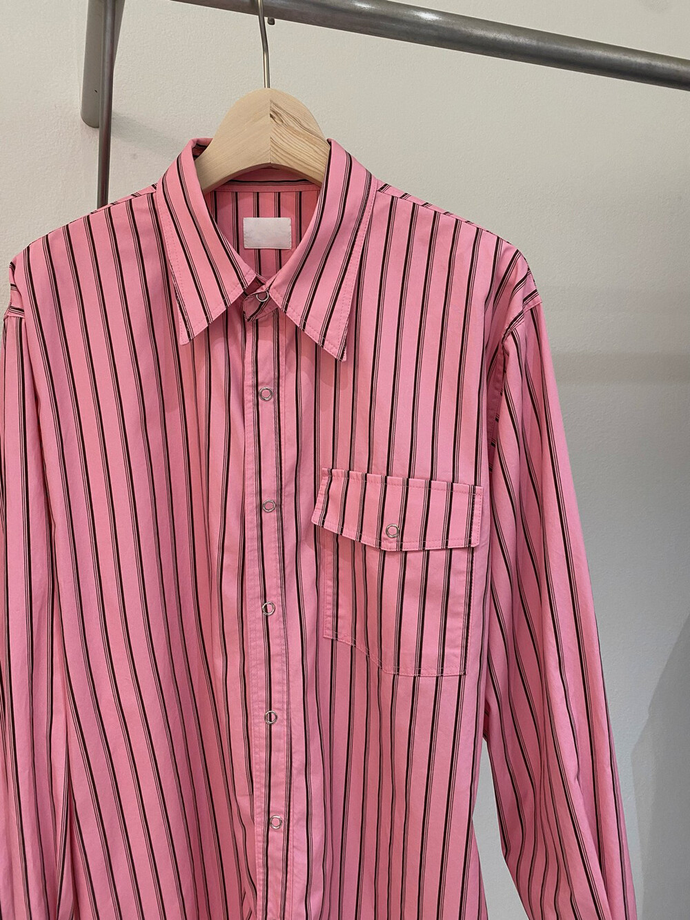 일반 셔츠 단추 대신, 미니멀한 스냅버튼으로 여밈을 마무리했어요.