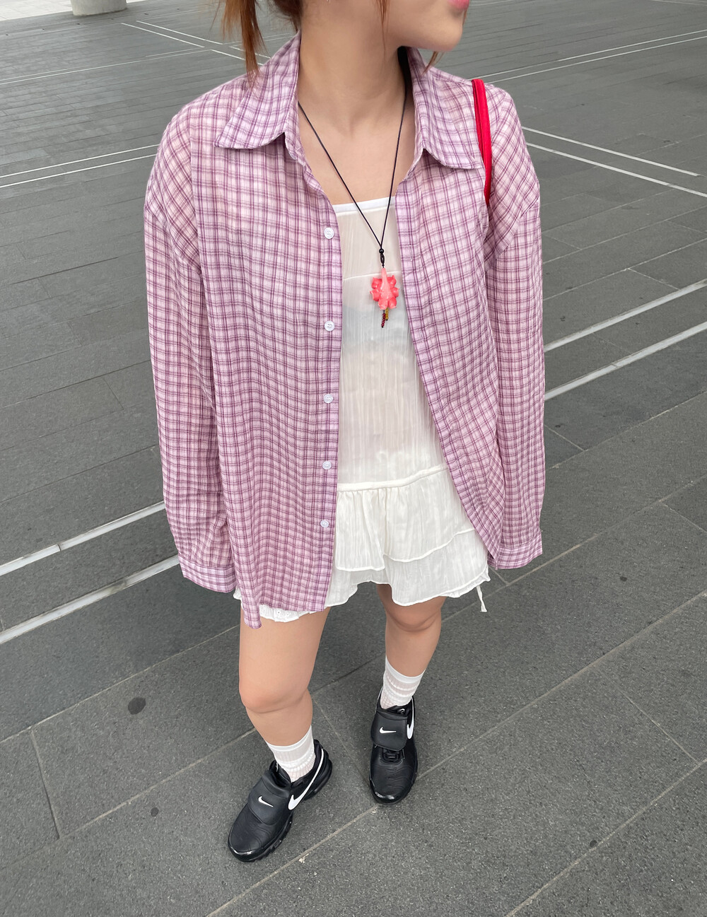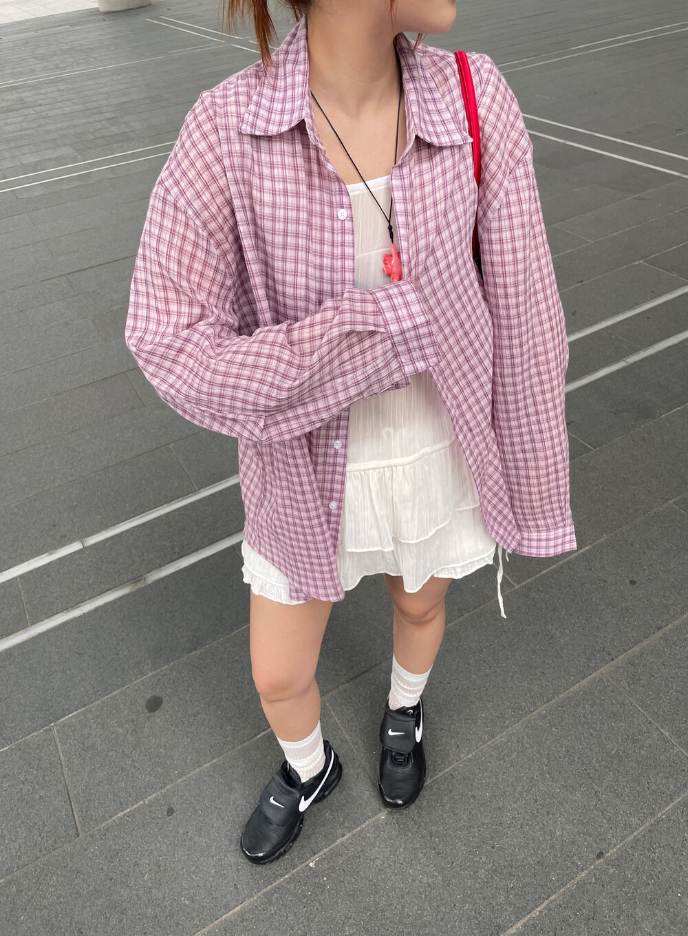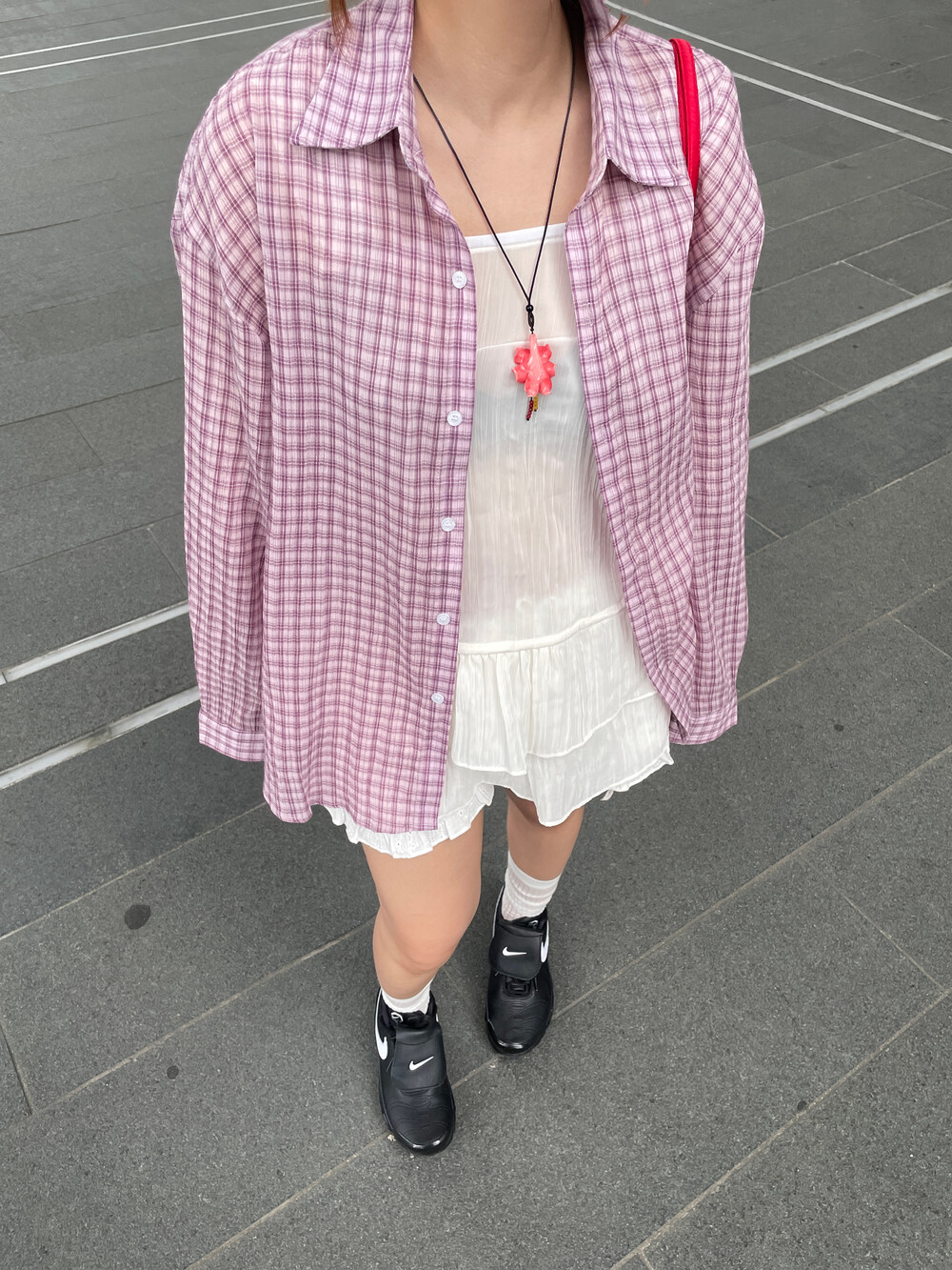 시어한 원사를 사용해 은은하게 비치는 매력적인 프릴 블라우스 탑입니다. 부드럽고 매끈하고 은은한 광택감으로 고급스러우면서도 프릴레이스가 더해져 사랑스러움이 담겨져있습니다.