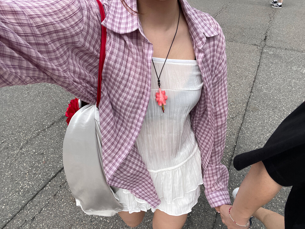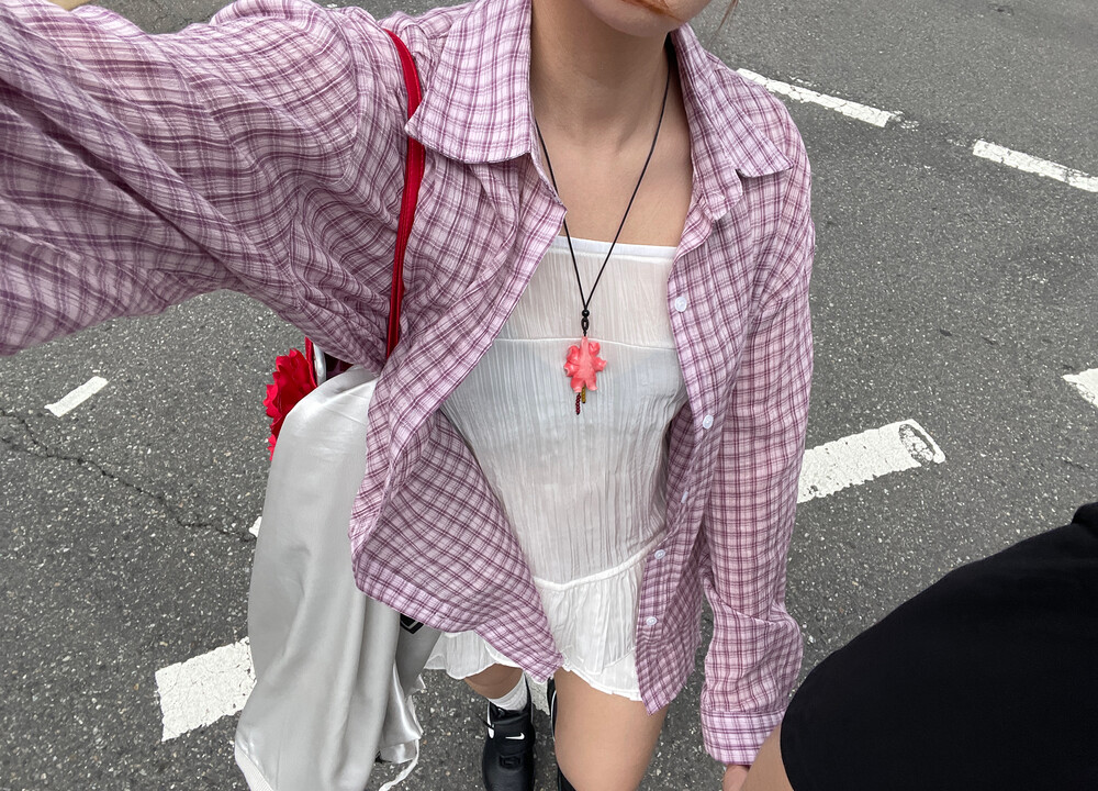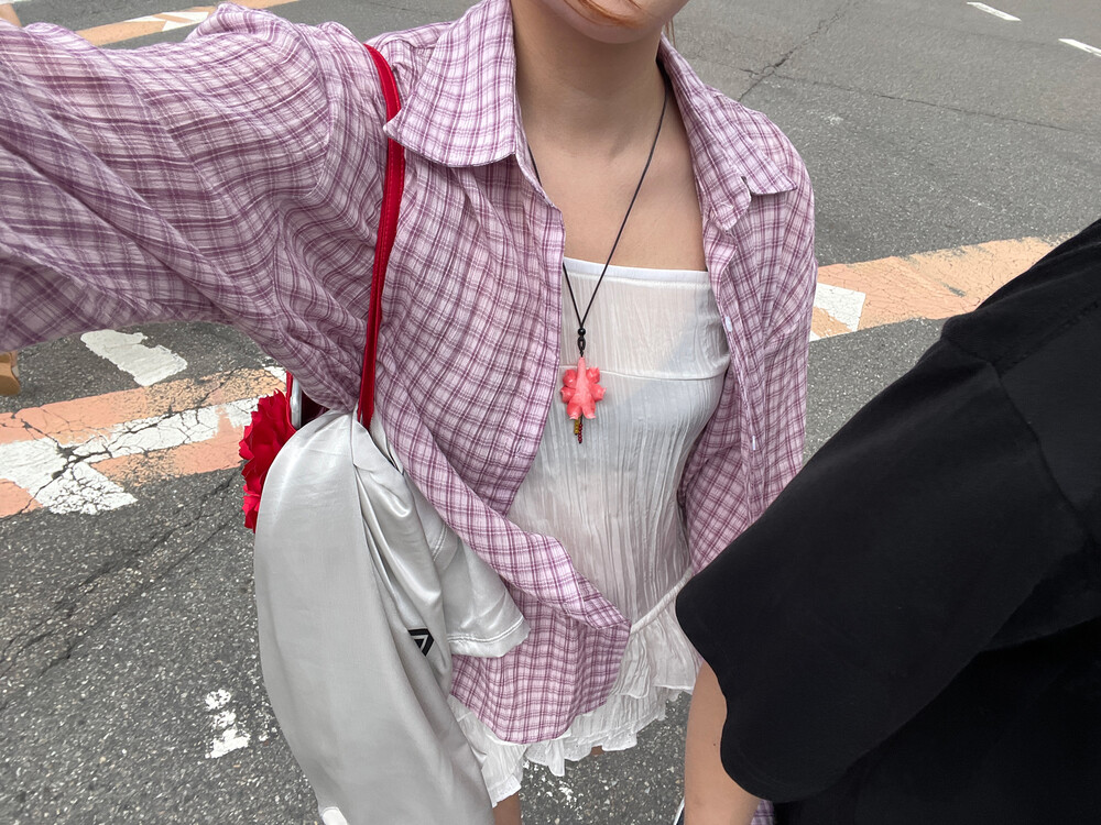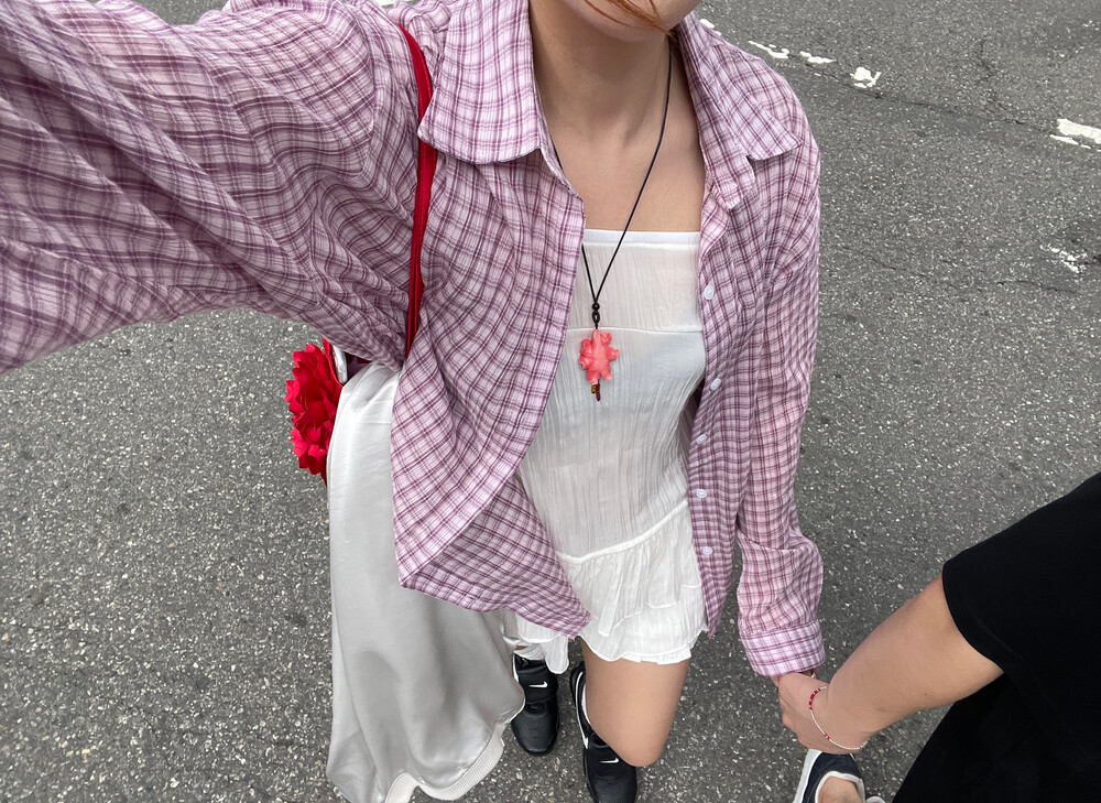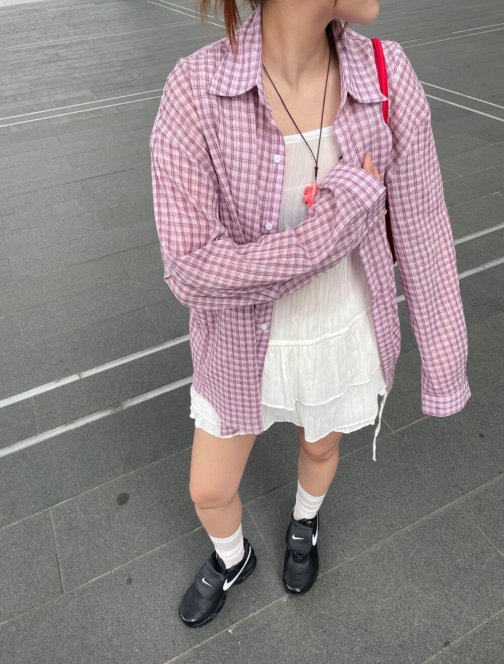 시어한 원사를 사용해 은은하게 비치는 매력적인 프릴 블라우스 탑입니다. 부드럽고 매끈하고 은은한 광택감으로 고급스러우면서도 프릴레이스가 더해져 사랑스러움이 담겨져있습니다.
