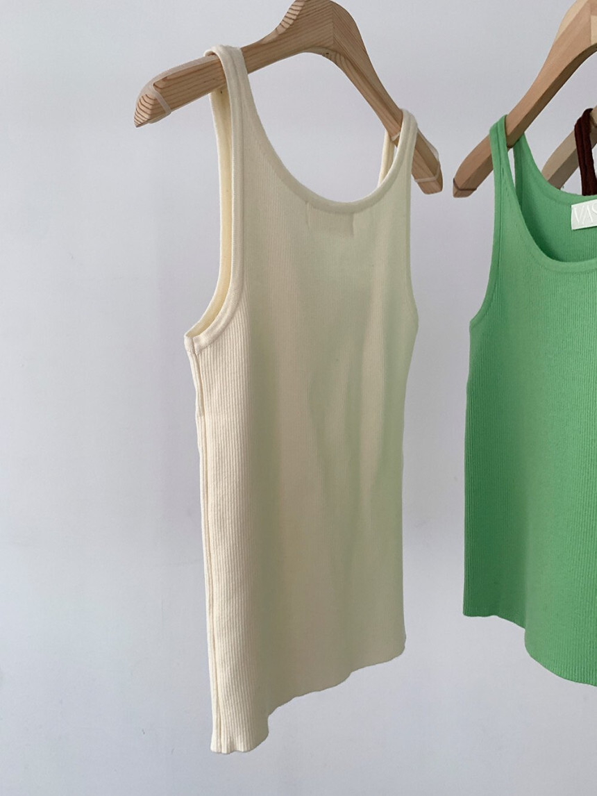- 자연스러운 곡선의 스쿱넥과 슬리브리스 디자인의 니트탱크탑입니다.