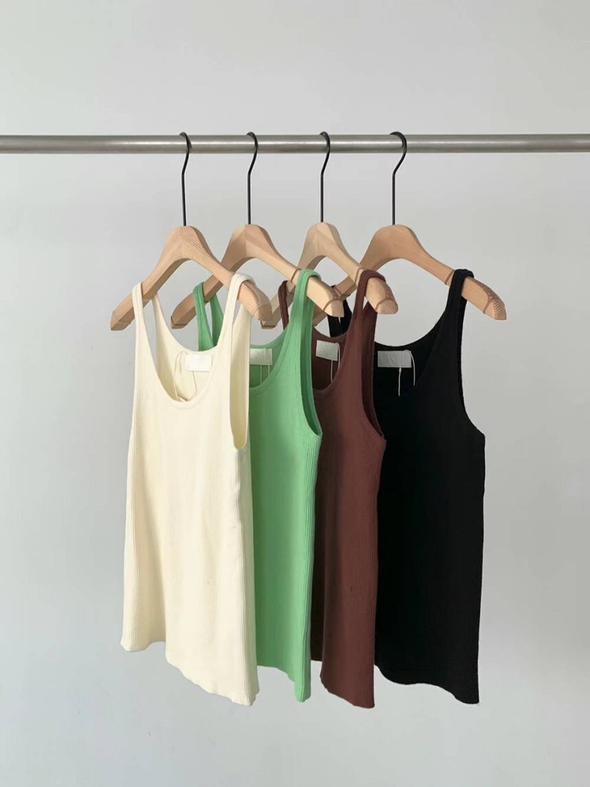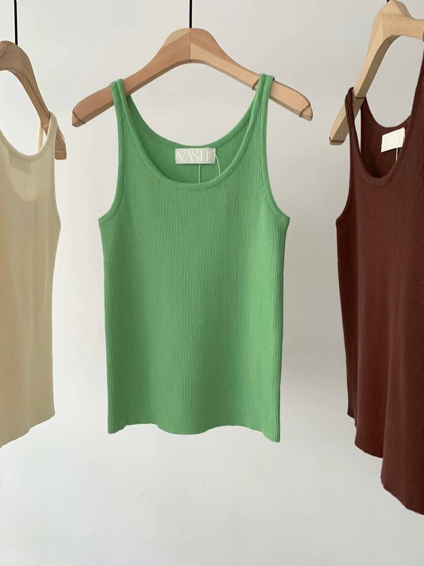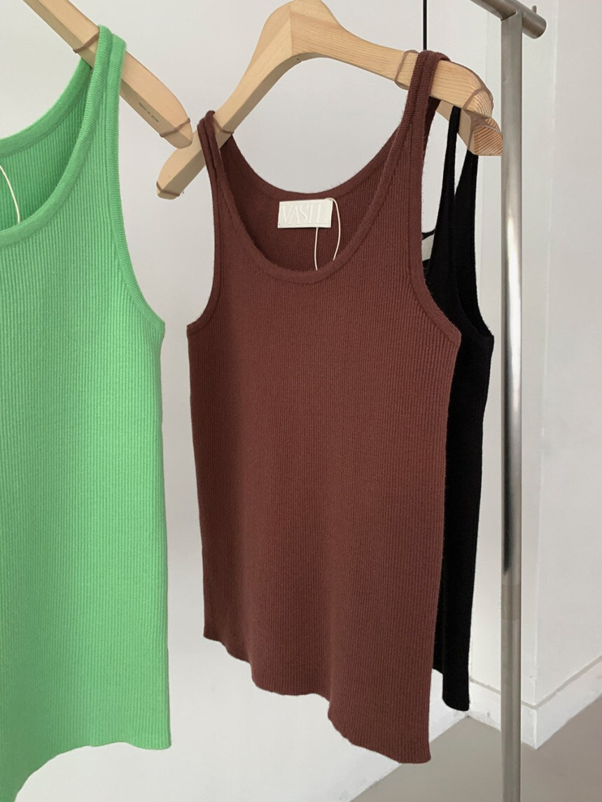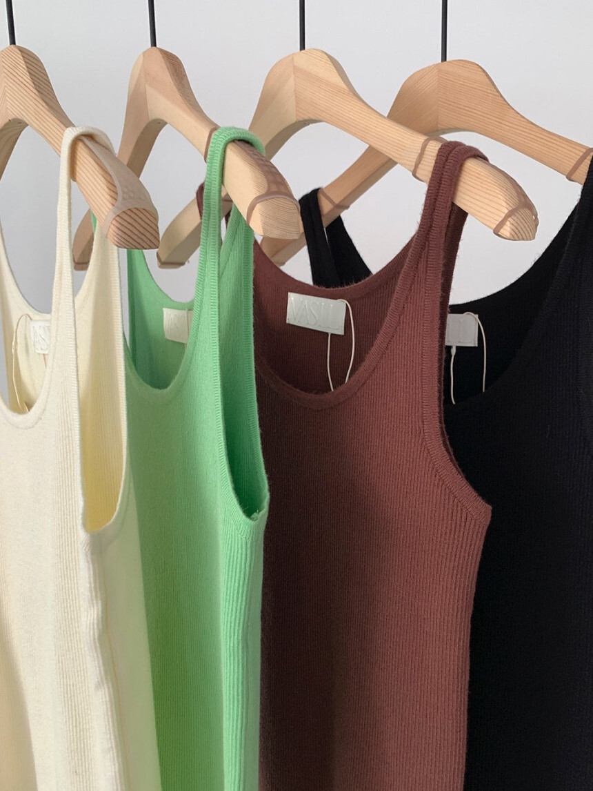 - 자연스러운 곡선의 스쿱넥과 슬리브리스 디자인의 니트탱크탑입니다.