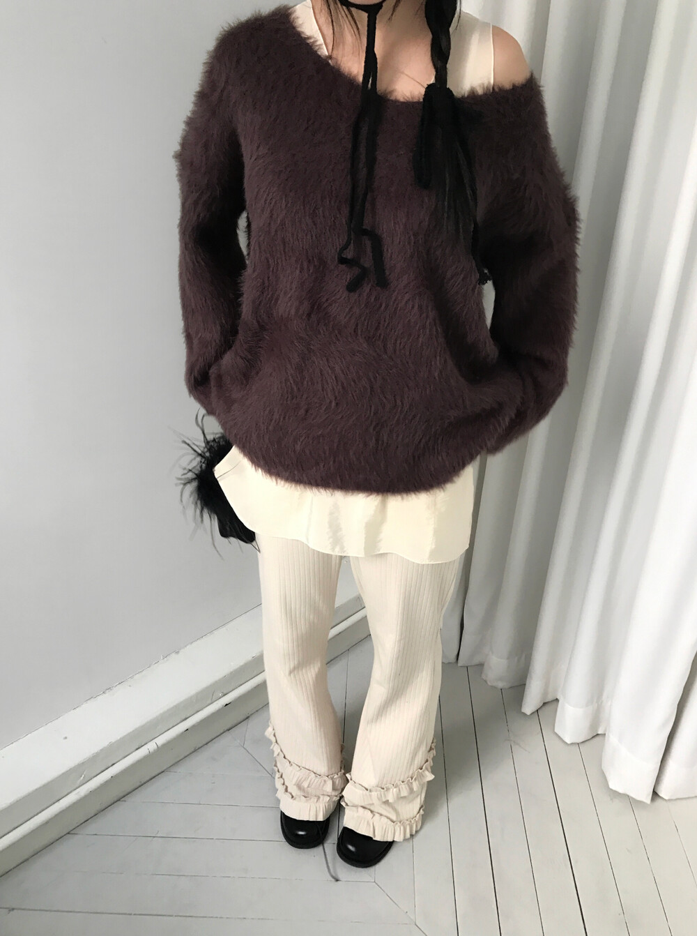 그리고 네크라인이 살짝 와이드한 브이넥으로 살짝 한쪽 어깨를 내려서 연출해도 분위기 전환하기에 좋은 그런 니트랍니다.