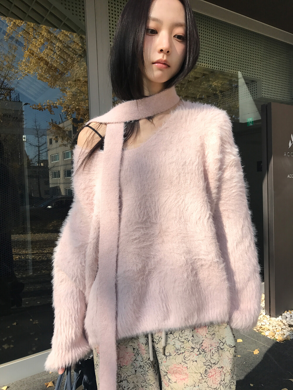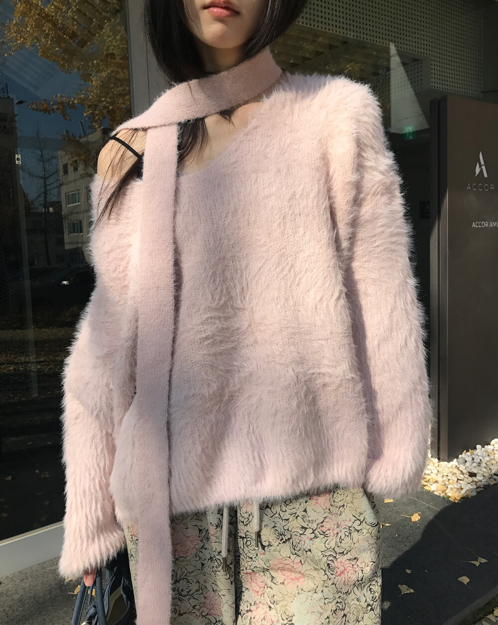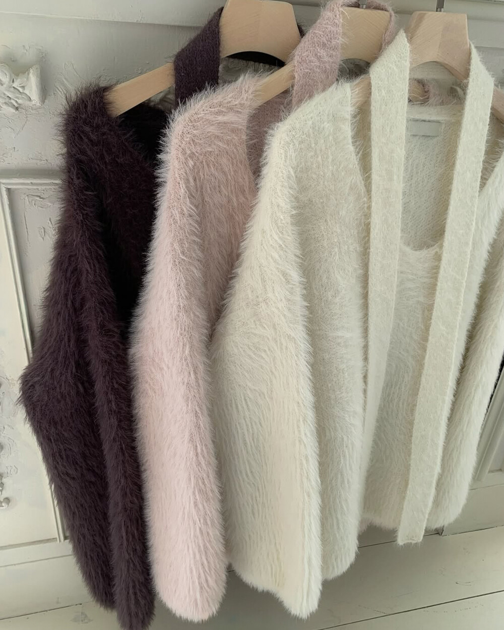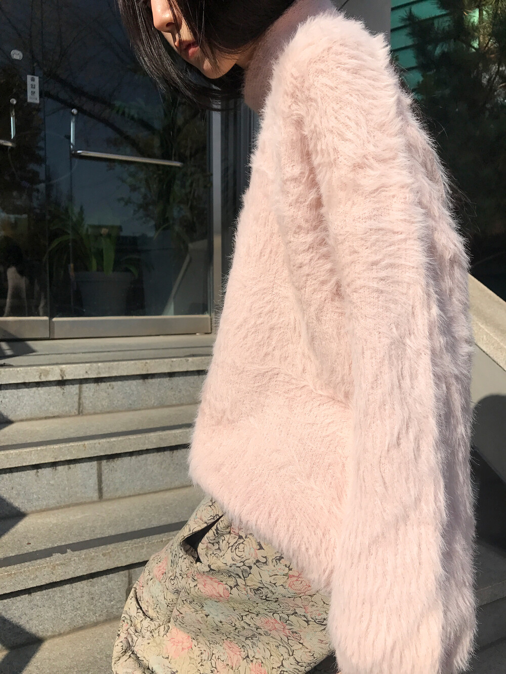- 헤어리한 텍스쳐의 베이비 퍼 브이넥 니트