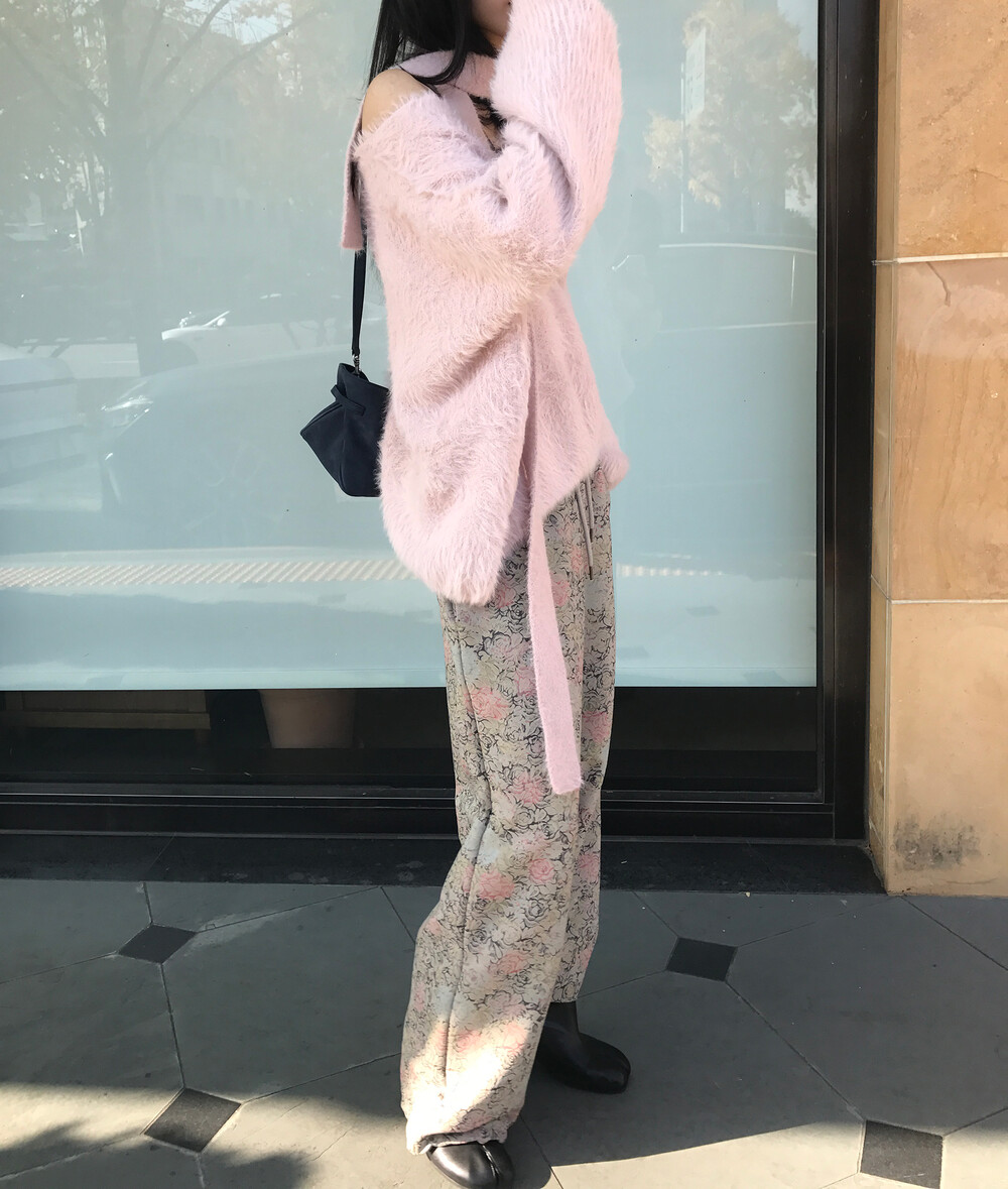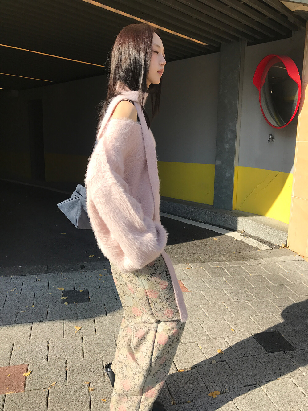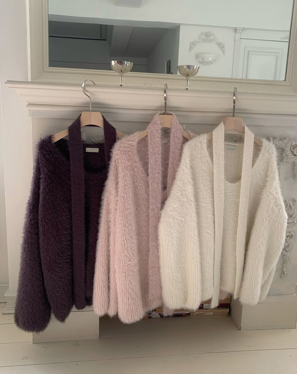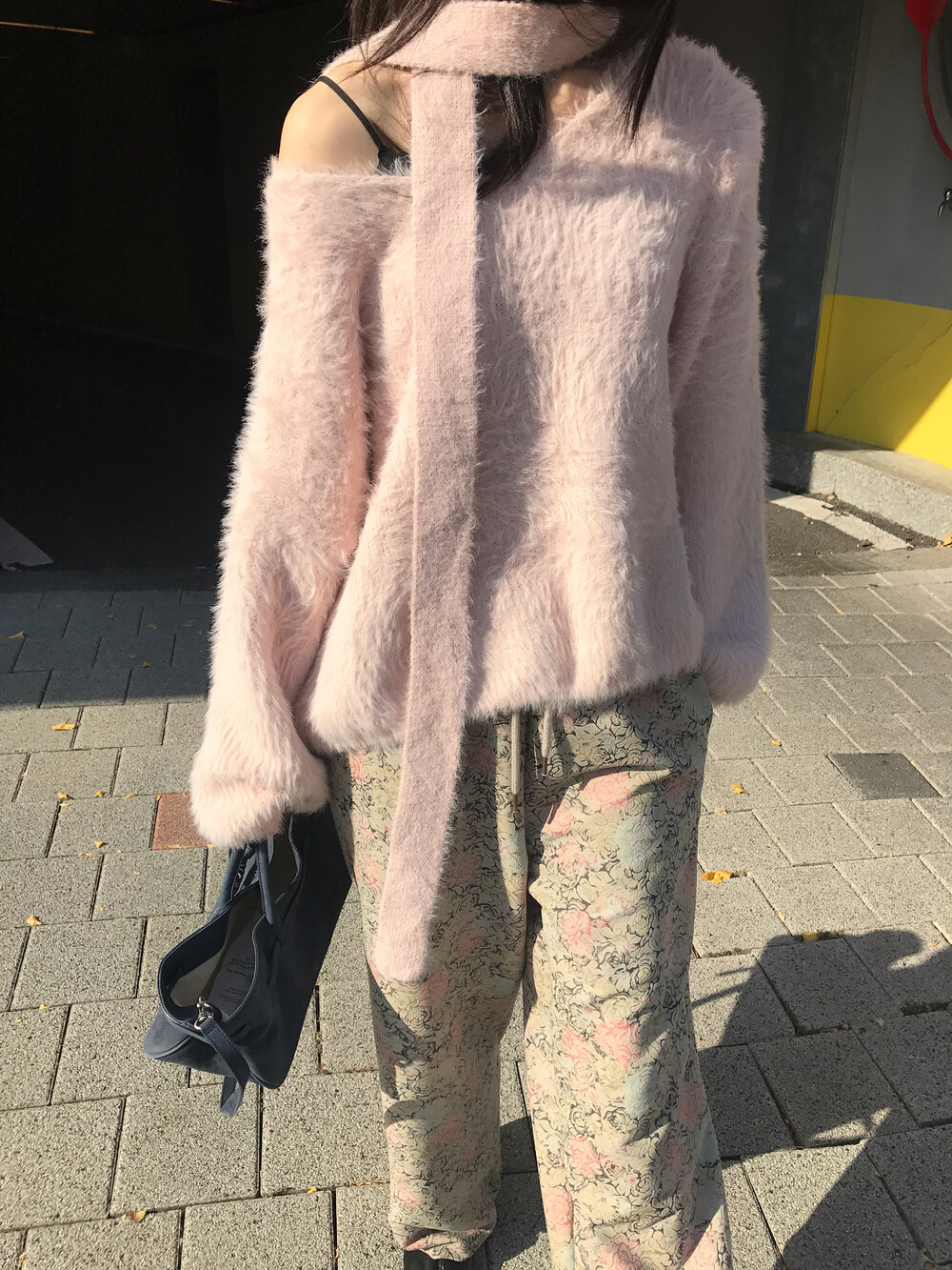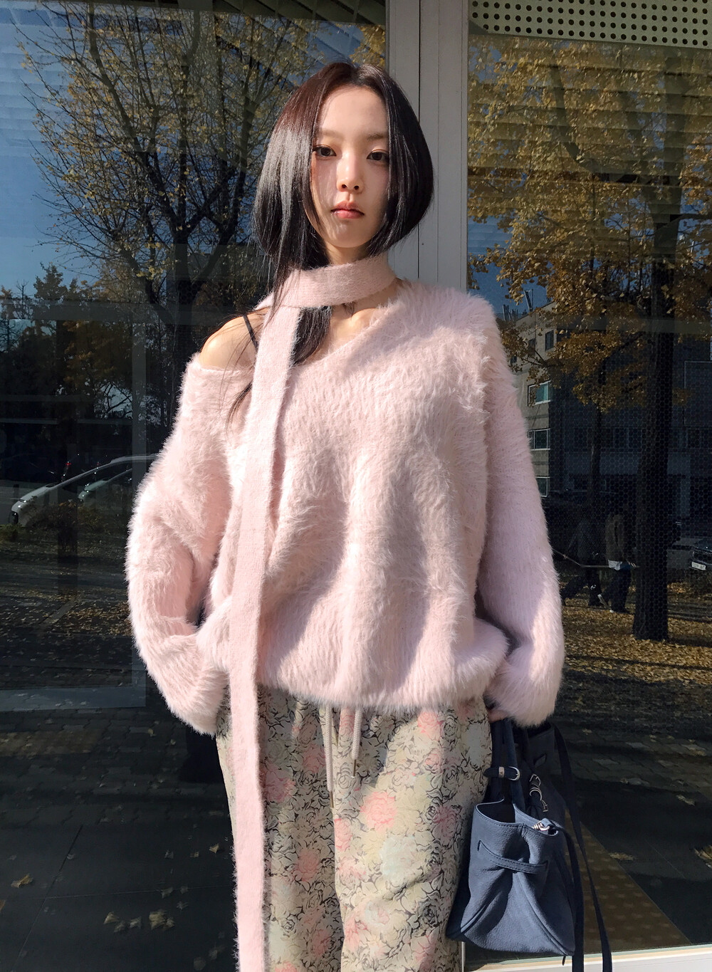 - 헤어리한 텍스쳐의 베이비 퍼 브이넥 니트