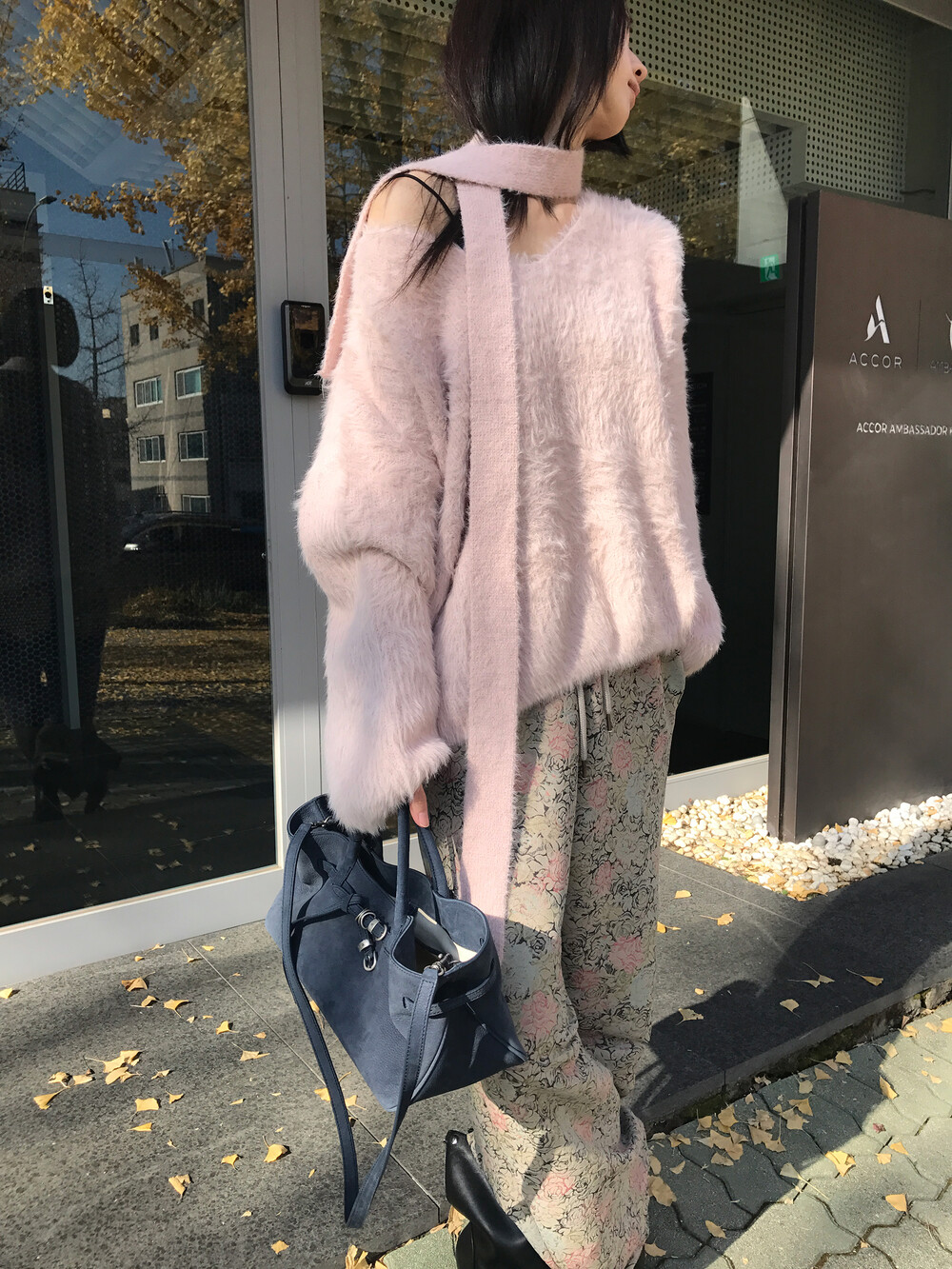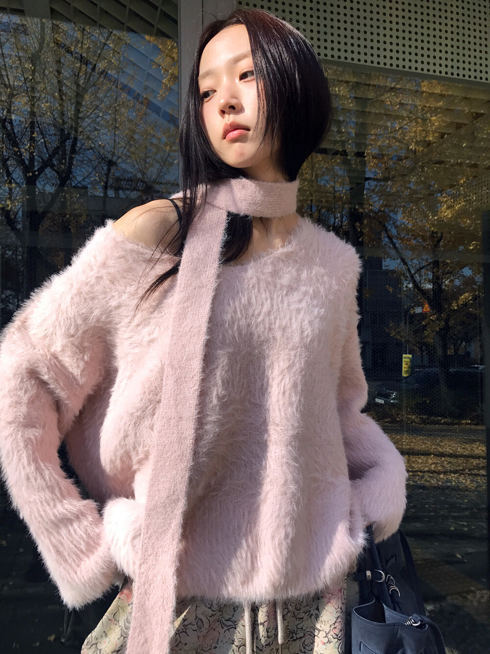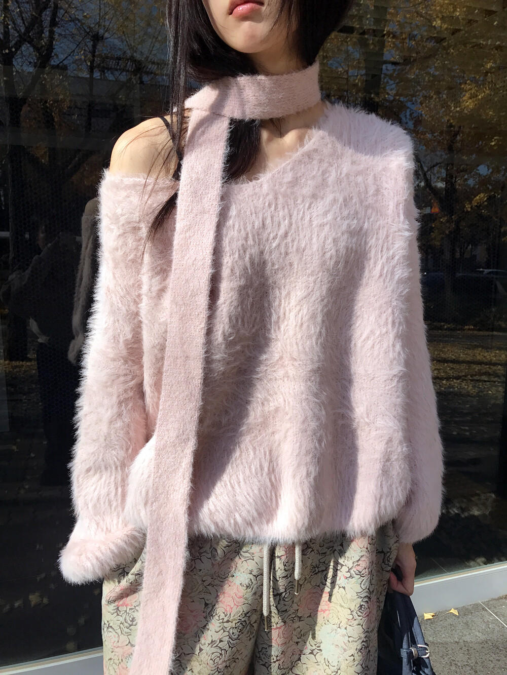 그리고 네크라인이 살짝 와이드한 브이넥으로 살짝 한쪽 어깨를 내려서 연출해도 분위기 전환하기에 좋은 그런 니트랍니다.