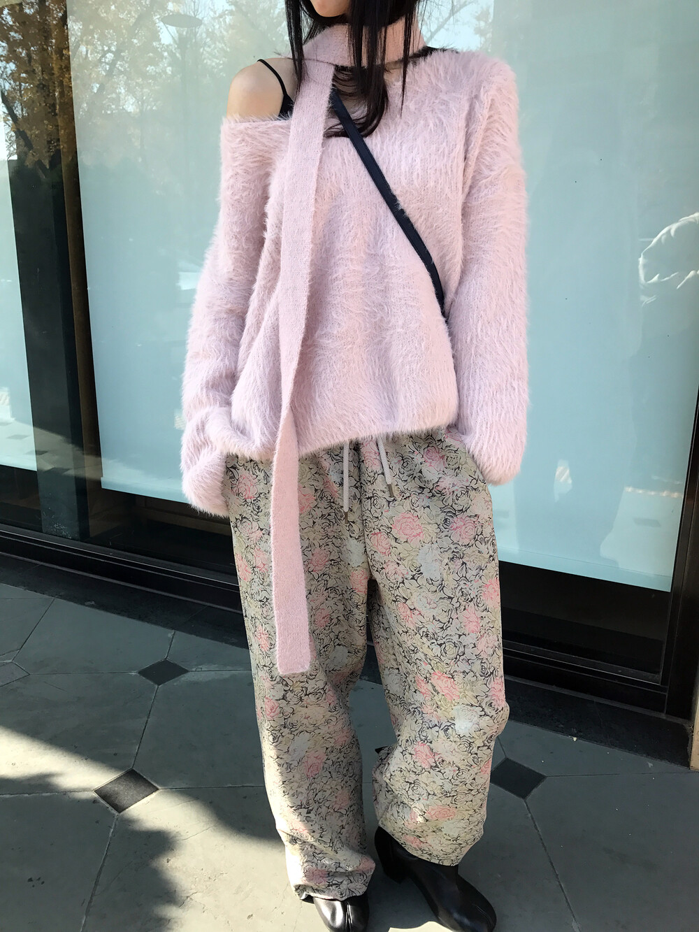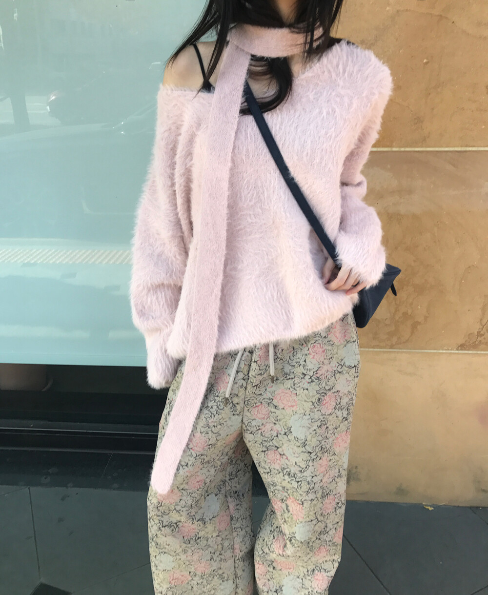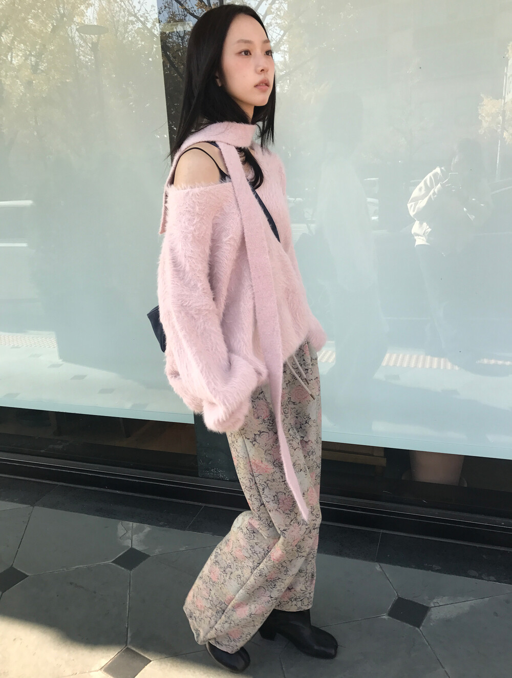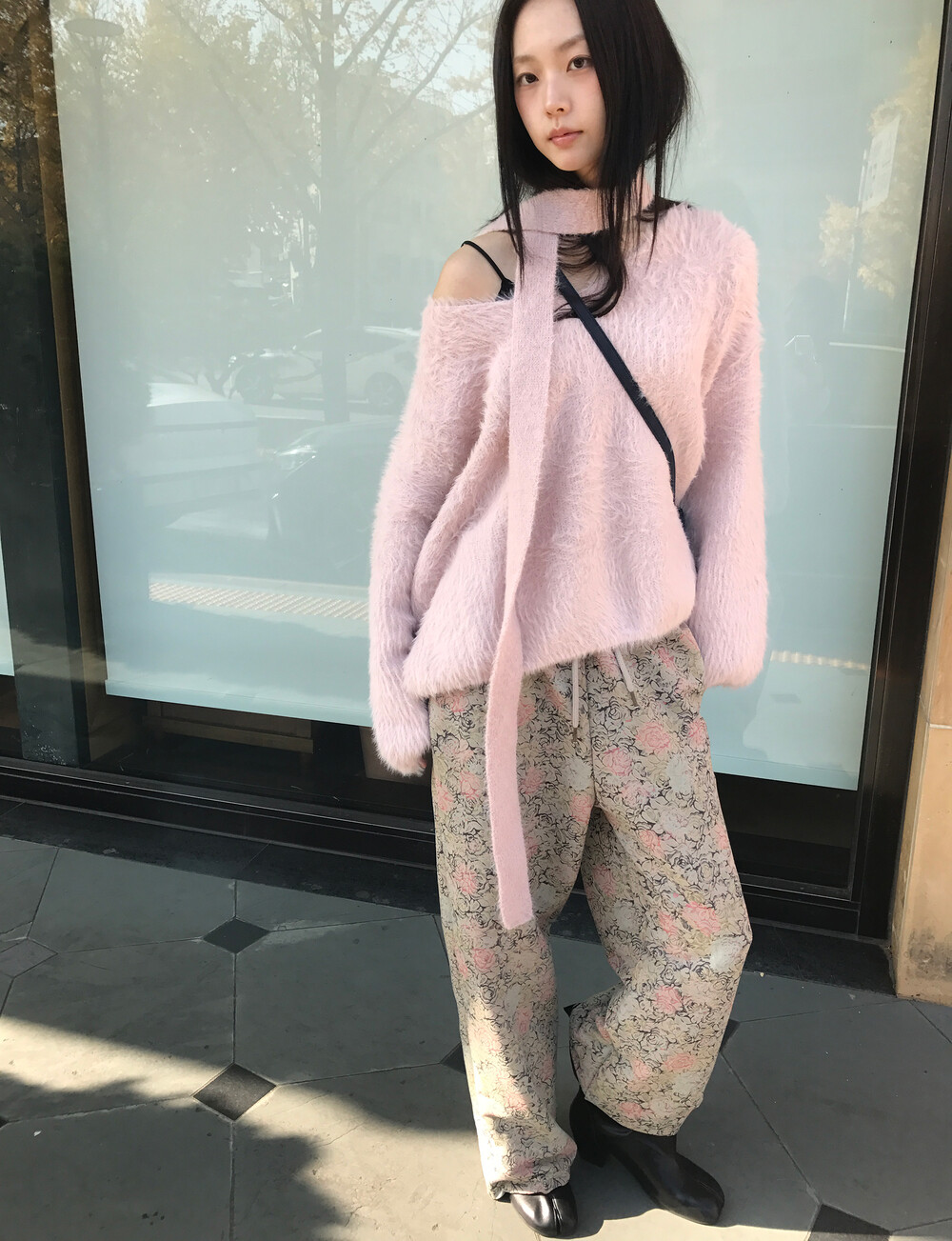그리고 네크라인이 살짝 와이드한 브이넥으로 살짝 한쪽 어깨를 내려서 연출해도 분위기 전환하기에 좋은 그런 니트랍니다.