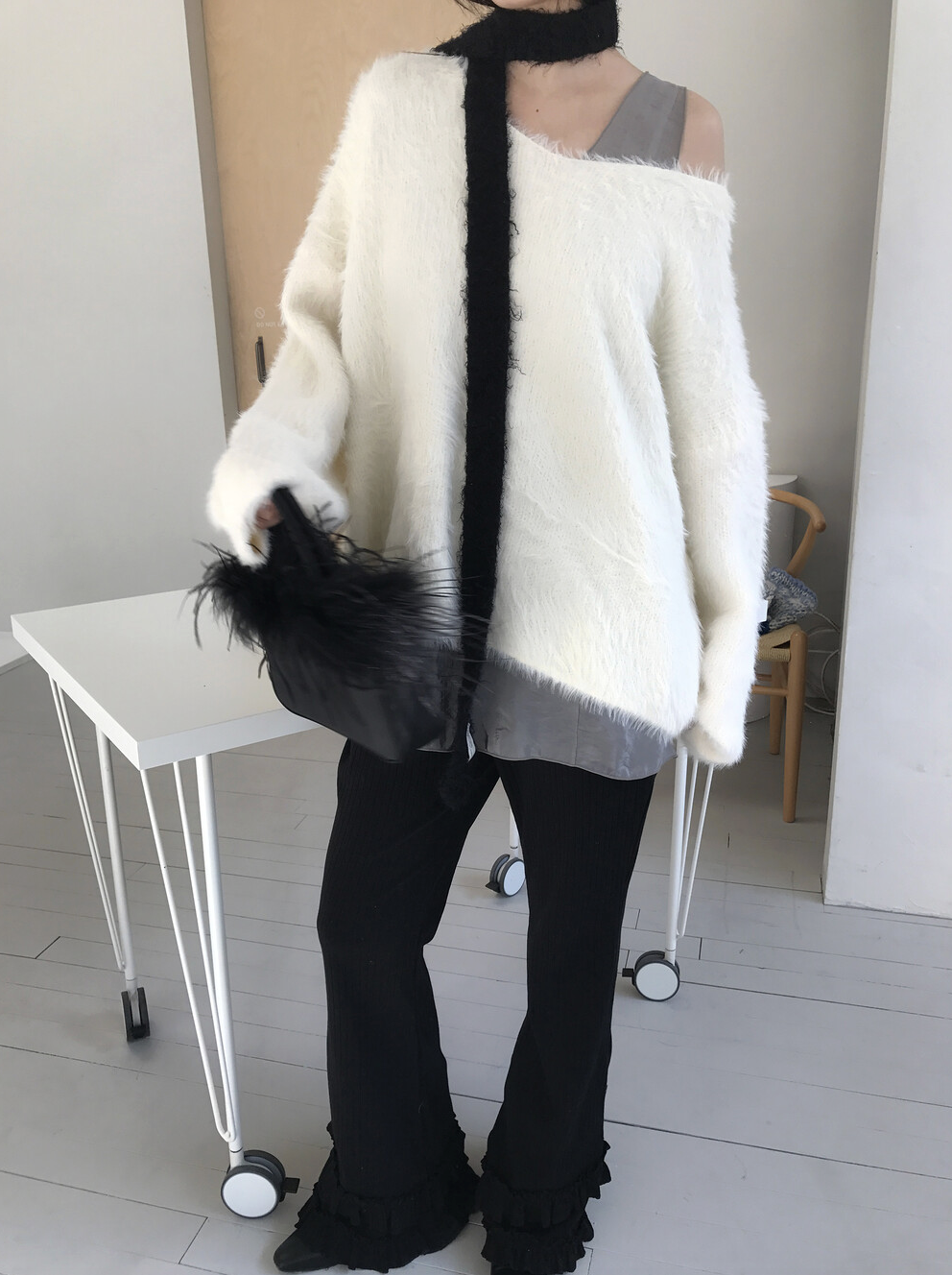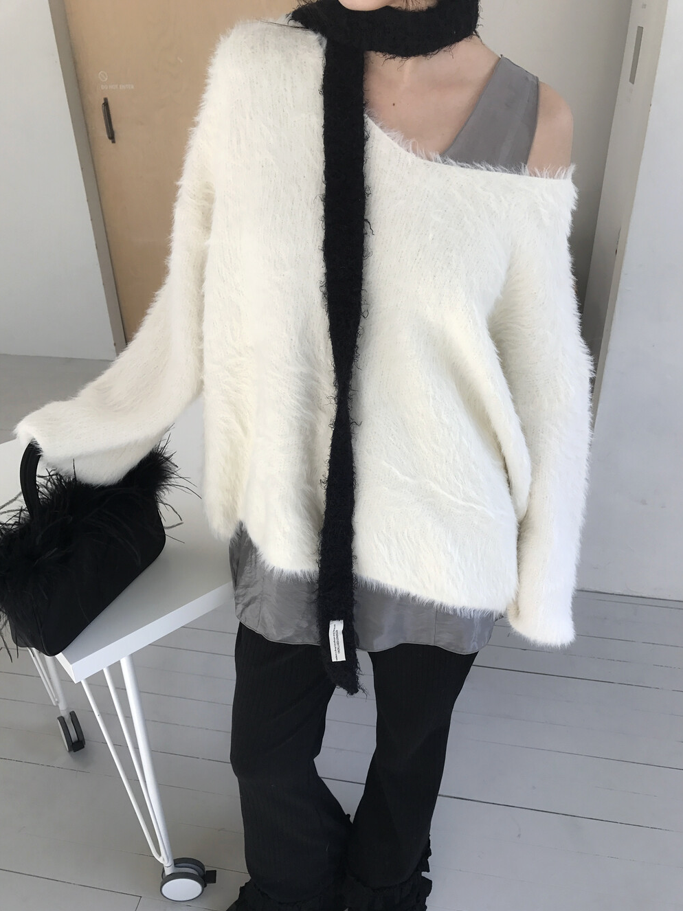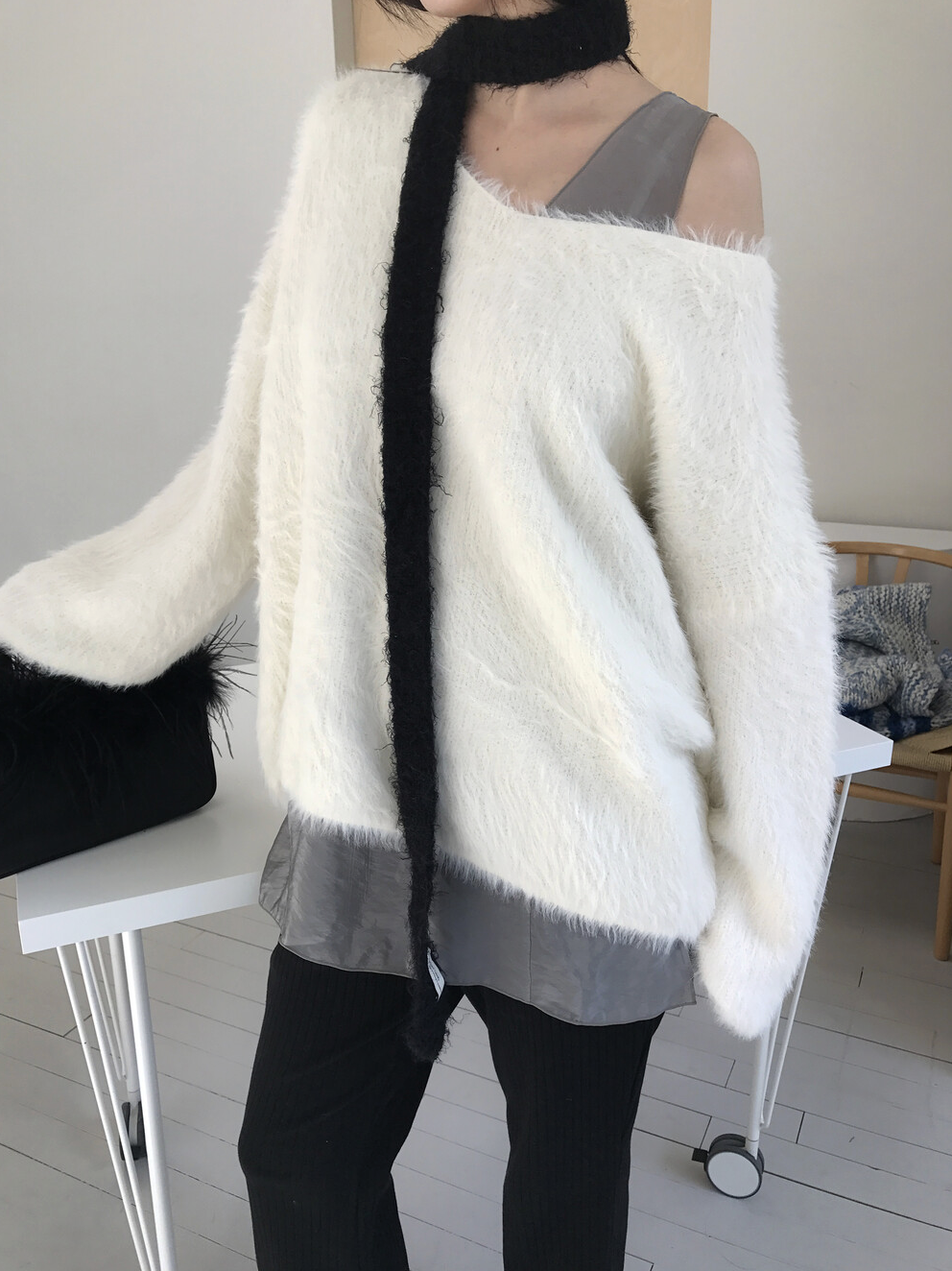 그리고 네크라인이 살짝 와이드한 브이넥으로 살짝 한쪽 어깨를 내려서 연출해도 분위기 전환하기에 좋은 그런 니트랍니다.
