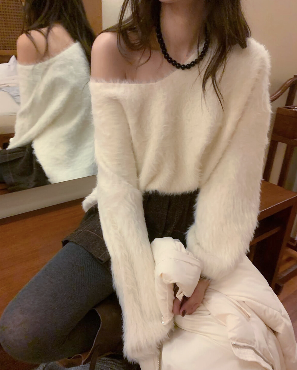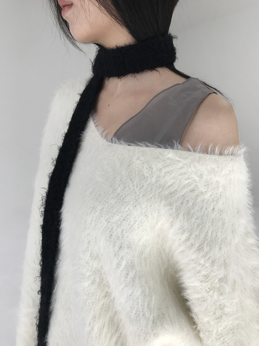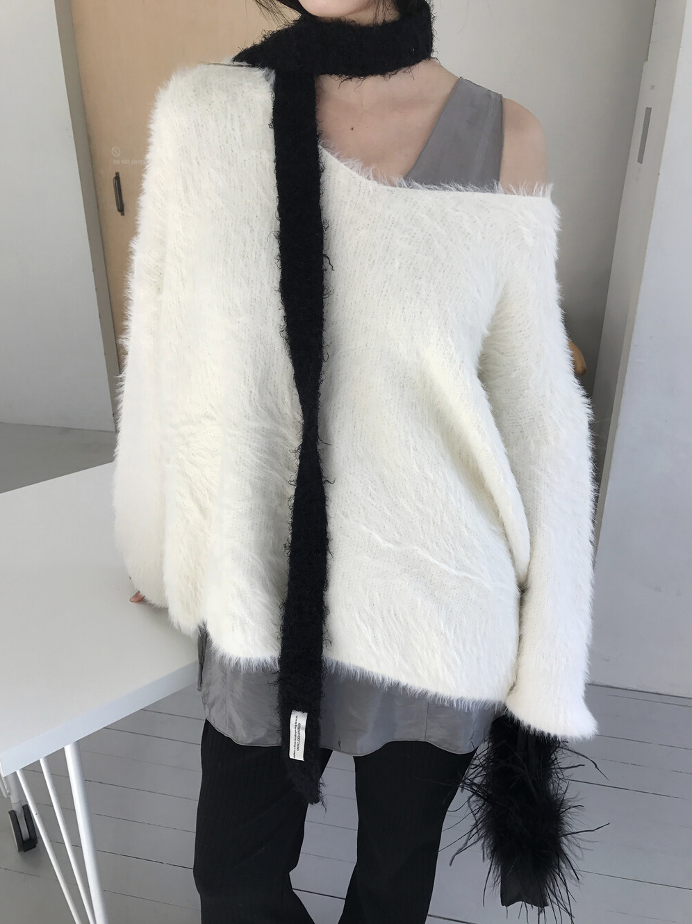 그리고 네크라인이 살짝 와이드한 브이넥으로 살짝 한쪽 어깨를 내려서 연출해도 분위기 전환하기에 좋은 그런 니트랍니다.