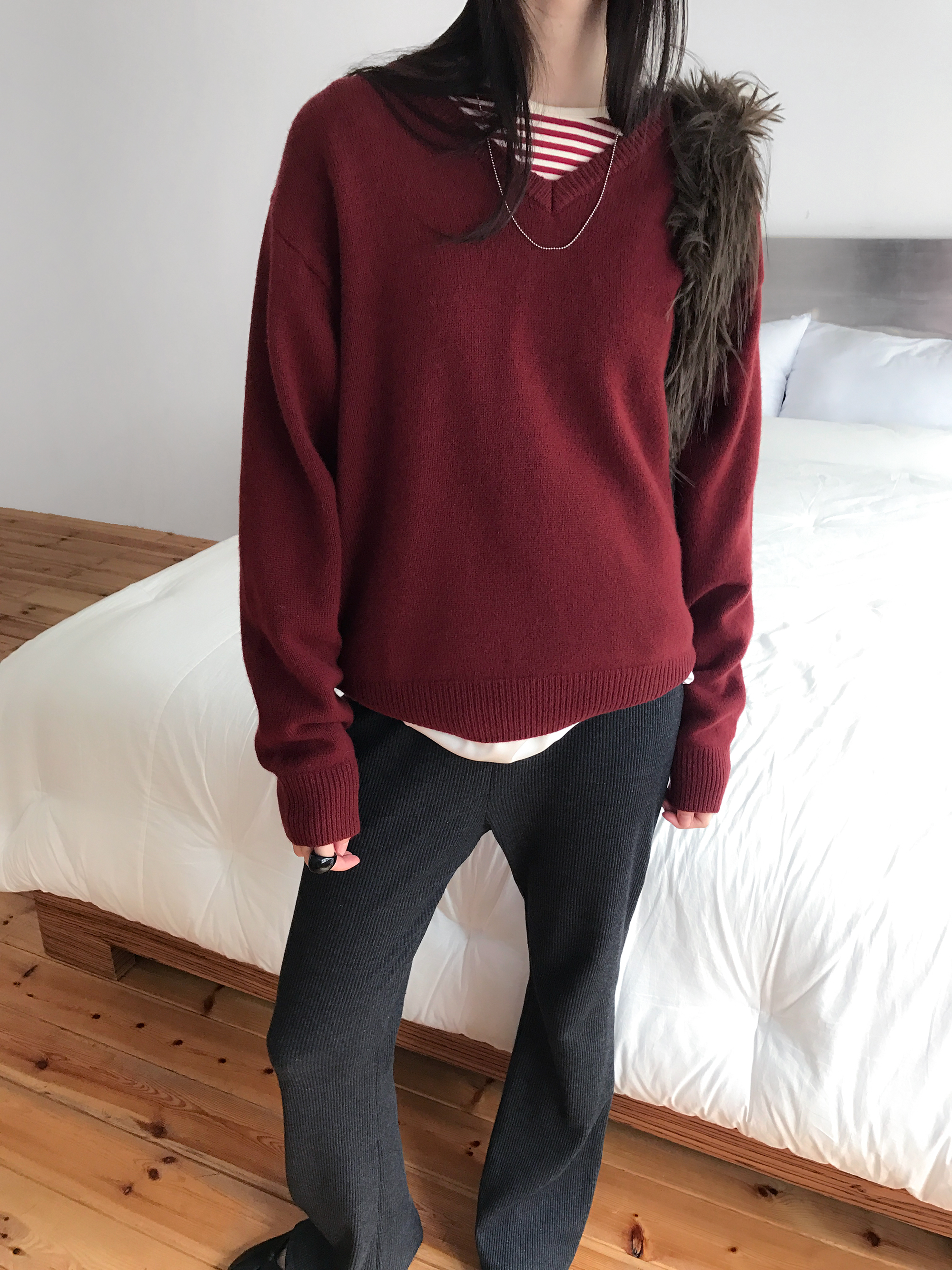 Macaroon Wool V-neck Knit, Brick Red (4c)