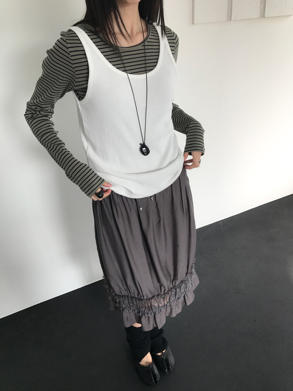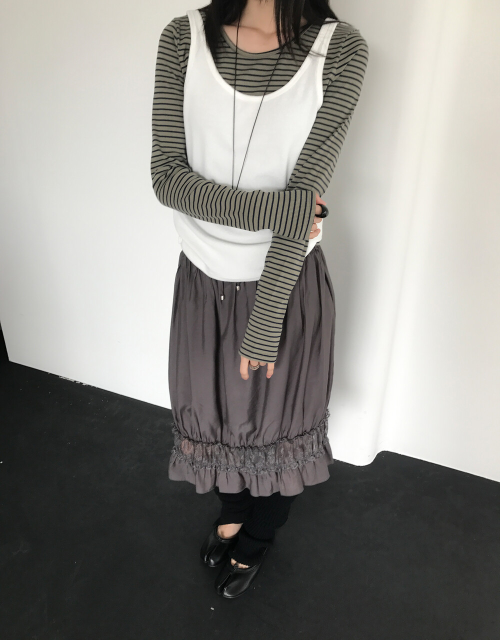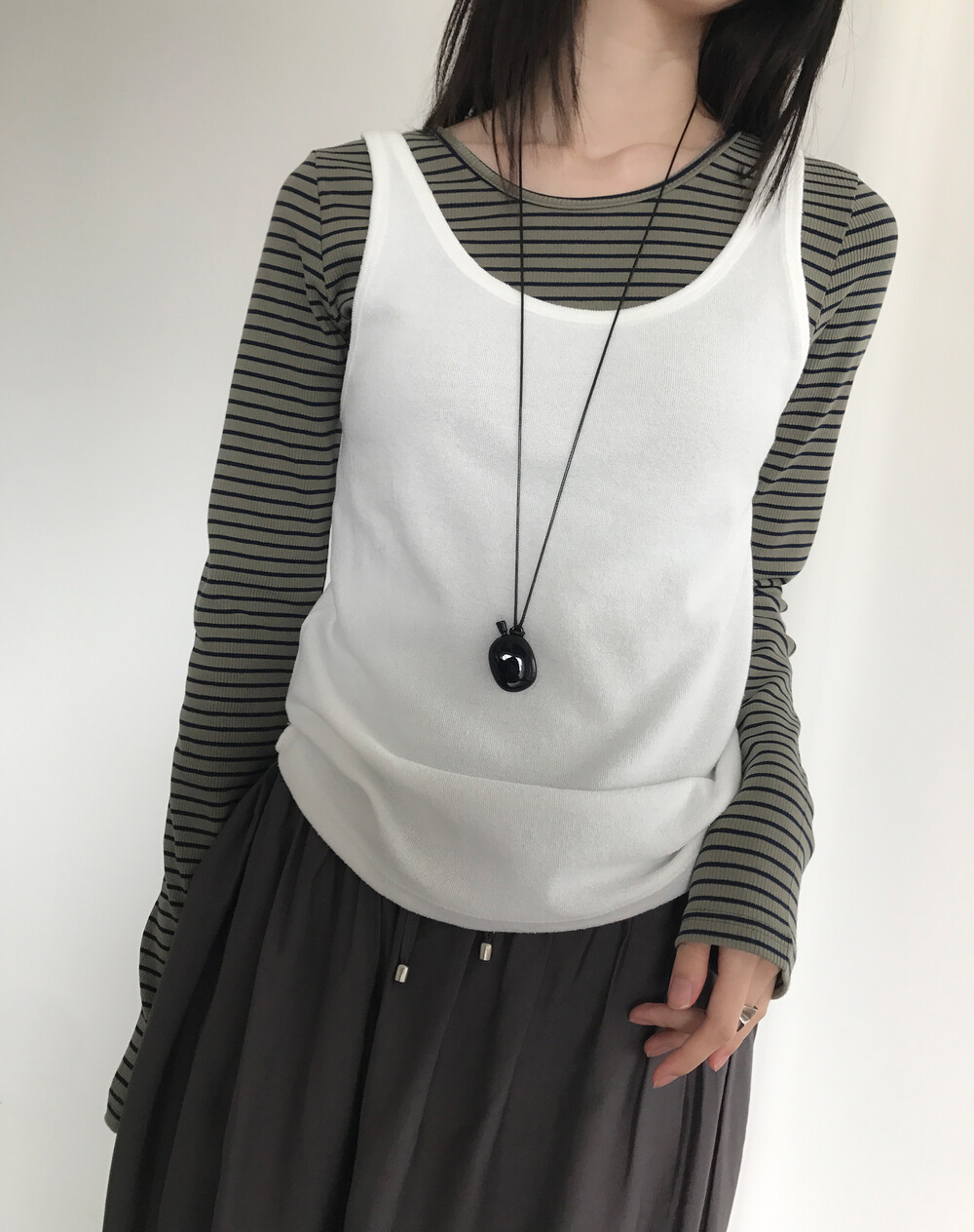 골반을 살짝 덮는 기장으로 단품은 물론 이너로도 다양하게 활용 가능