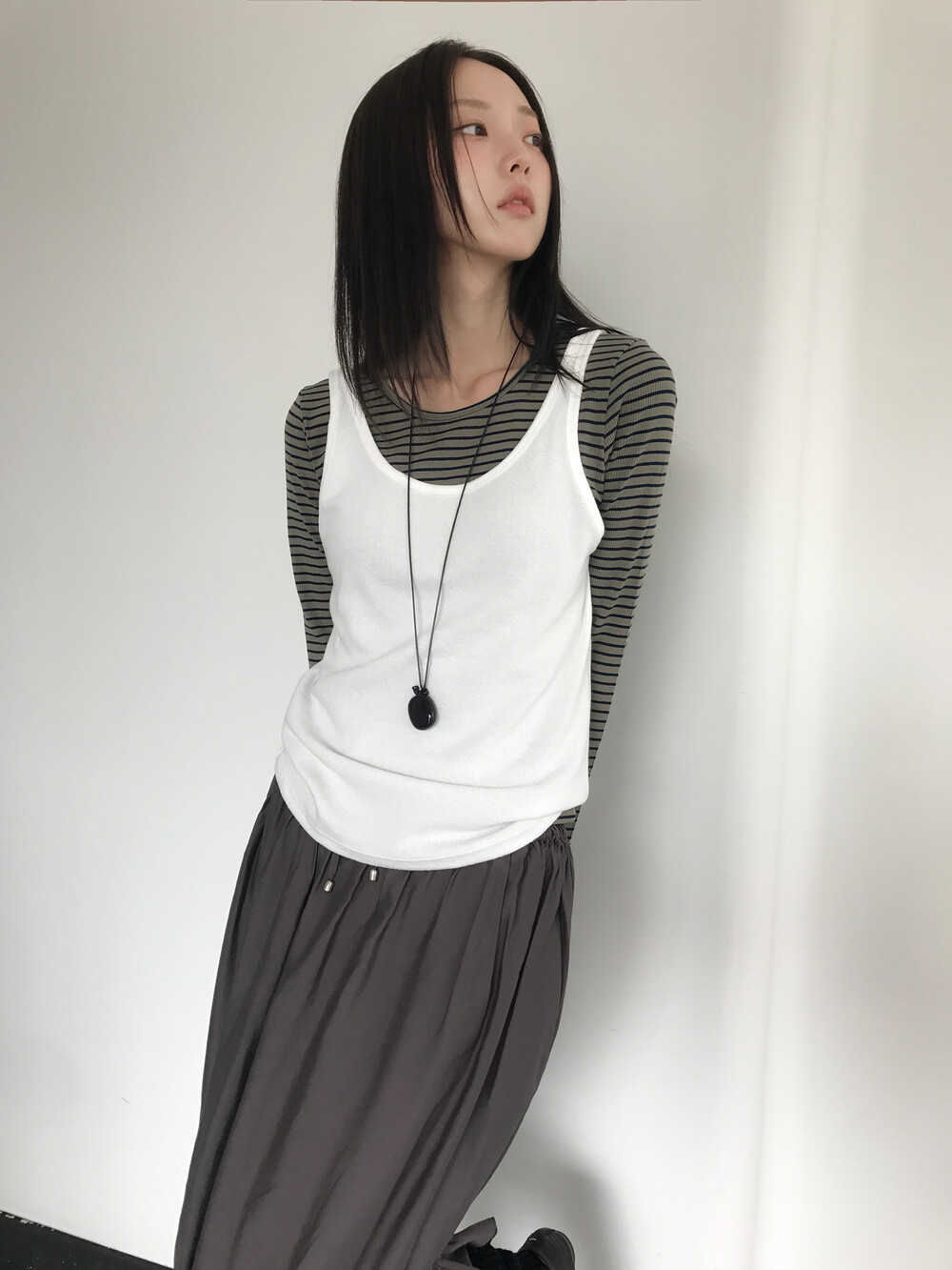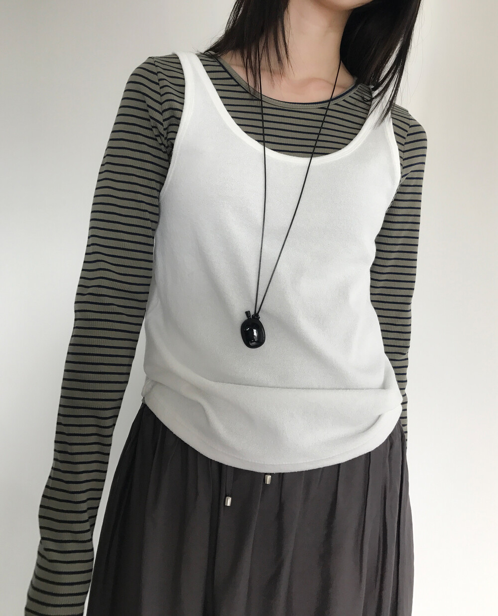 원단 자체에 약간의 고시감(탄탄한 힘)이 있어 흐물거리거나 들러붙지 않고, 깔끔하게 떨어지는 실루엣이 특징인 슬리브리스 캐미솔 탑.