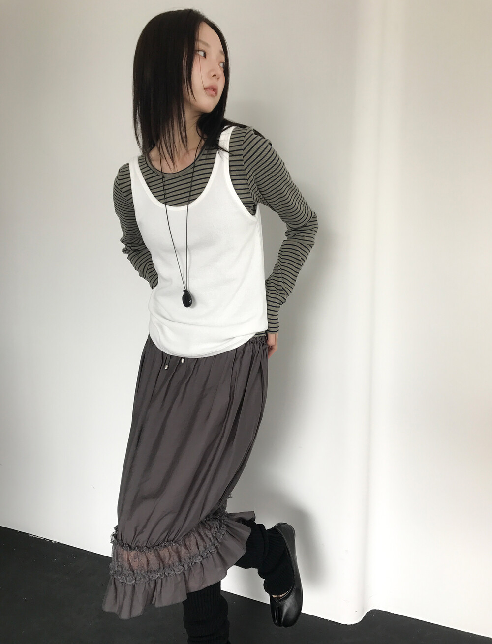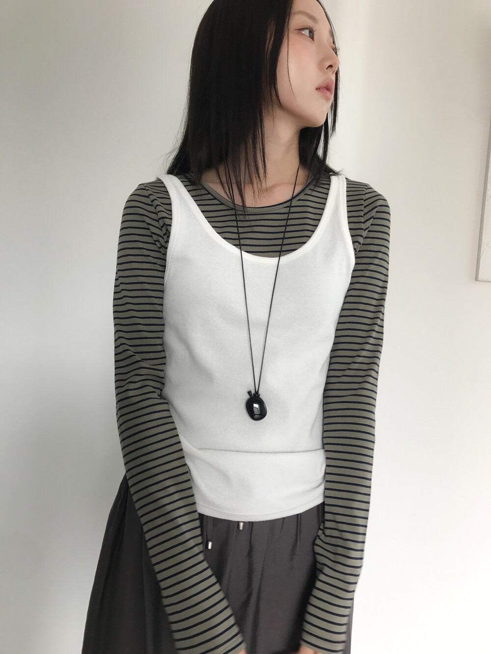 심플한 스퀘어형 U넥 라인으로 목선을 부드럽게 강조