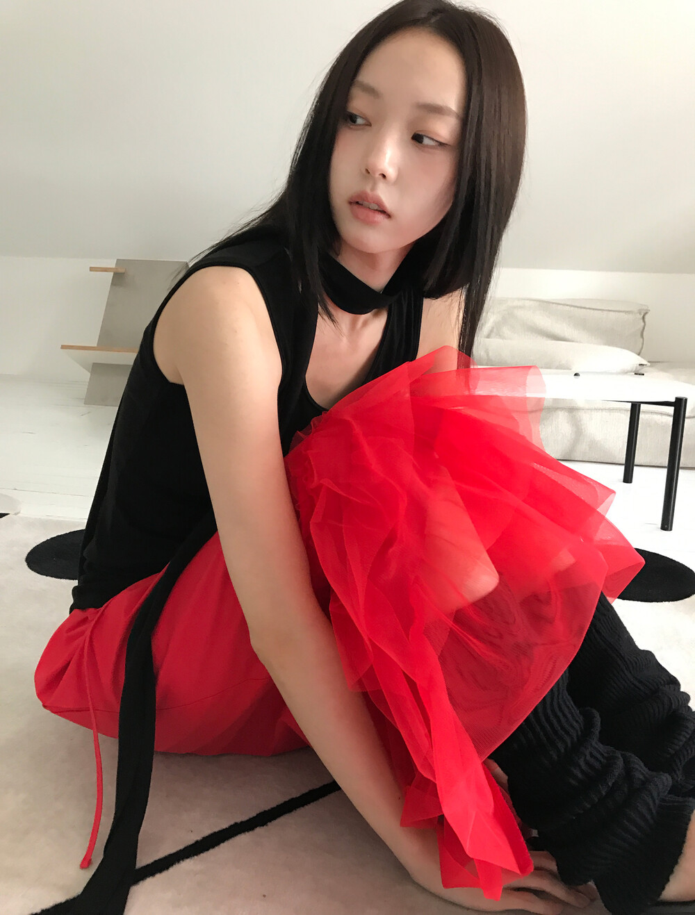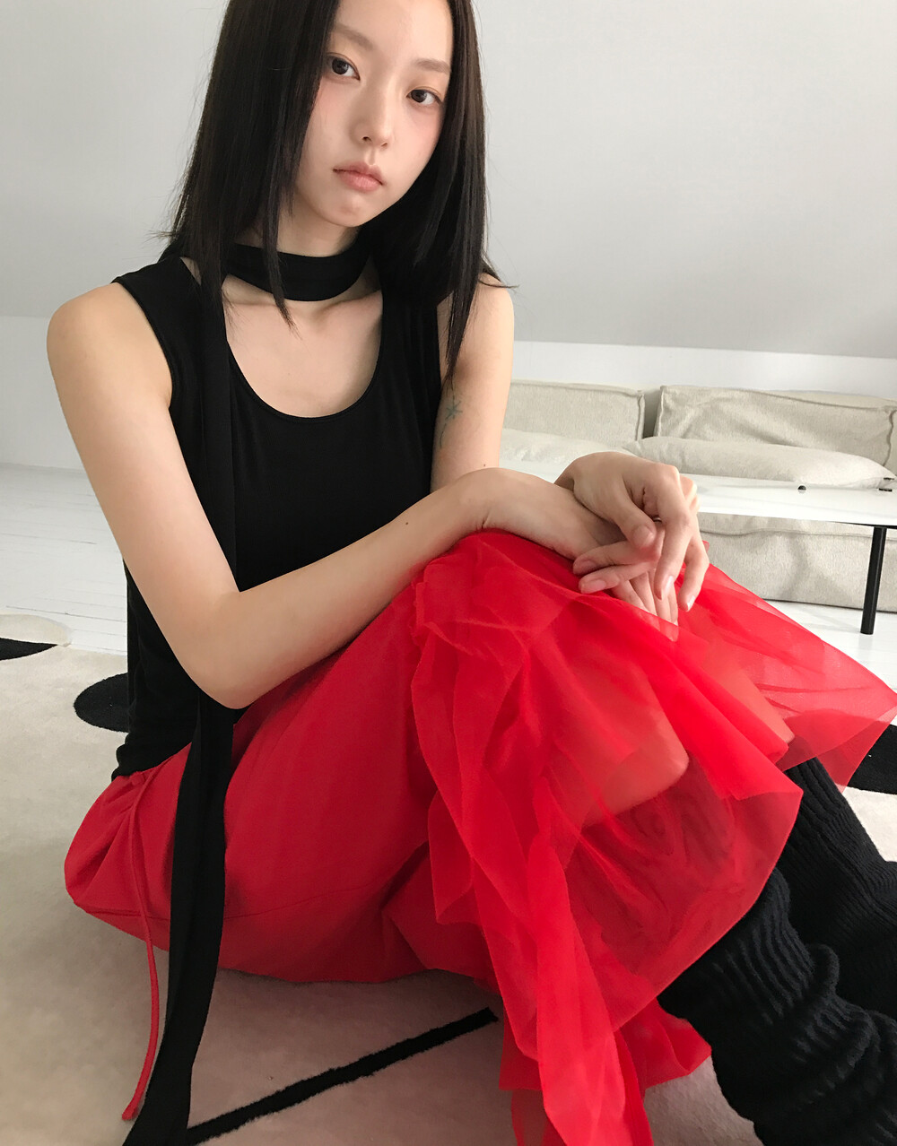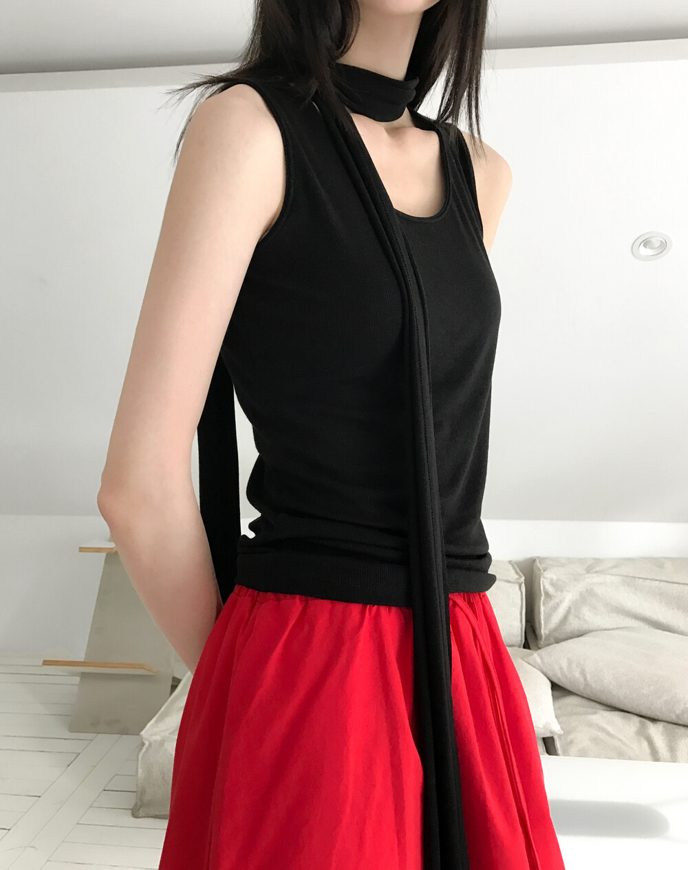 이 테이프 슬리브리스가 다른 나시와 다른점은 바로 부드럽고 흐르는 동일한 소재로 제작된 스카프가 세트로 제작되었다는 점이에요.