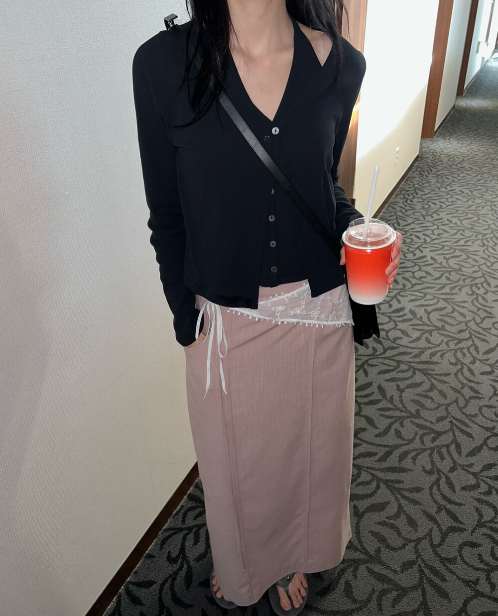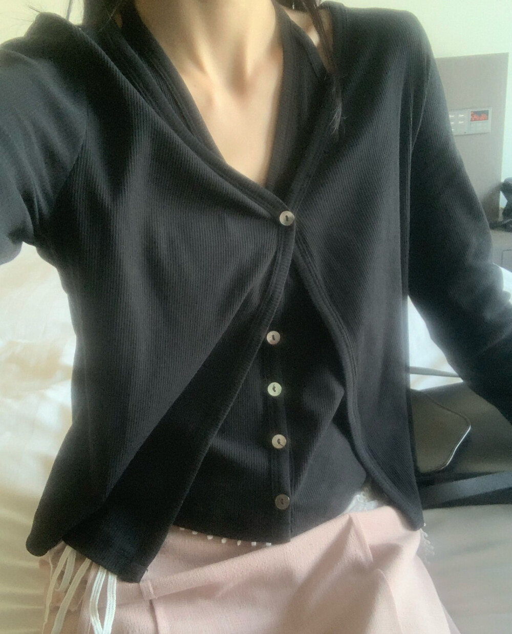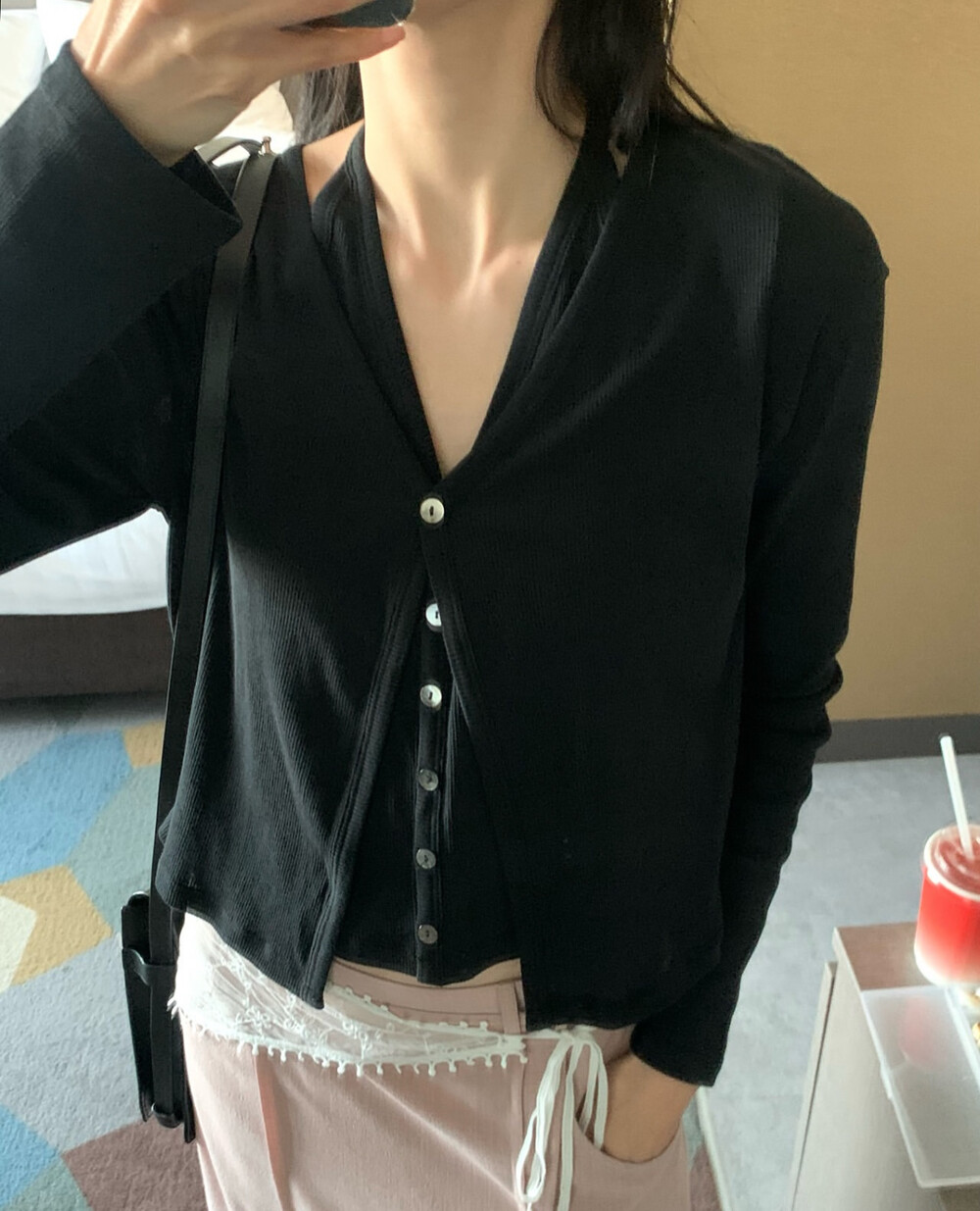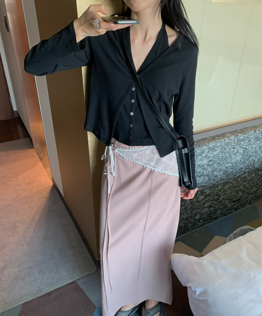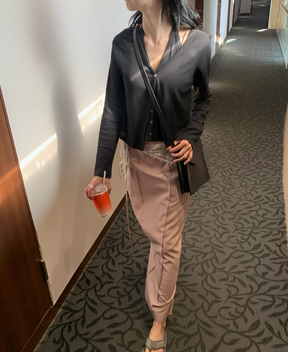 코튼 100의 소재이지만, 착용시 텁텁함이 없는 강연소재로 흐르는 핏이 굉장히 예쁘더라구요 *.* 그래서 덕분에 매우 슬림하게 만들어주기까지 하는 똑똑한 아이템이었어요! 얇은 소재라서 혹여 비침을 걱정하실 수도 있지만, 앞판이 두겹으로 레이어드 되어있어 비침이 거의 없다는 장점까지 갖추었답니다. 홀터탑과 가디건이 일체형으로 만들어져 여름내내 단품으로 착용하기에 좋은 아이템이랍니다! 간혹 급한 아침 출근시간이나 외출시에 이너와 아우터를 챙겨입기엔 조금 더울 것 같고 그렇다고 조금 신경써야할 때 고민없이 빠르게 해결할 수 있는 똑똑한 아이템이에요 ❤︎ 이너인 홀터탑의 단추는 장식용으로 오픈이 불가능하지만, 가디건의 단추는 오픈/클로징이 가능해 원하는대로 자유롭게 연출할 수 있어요!