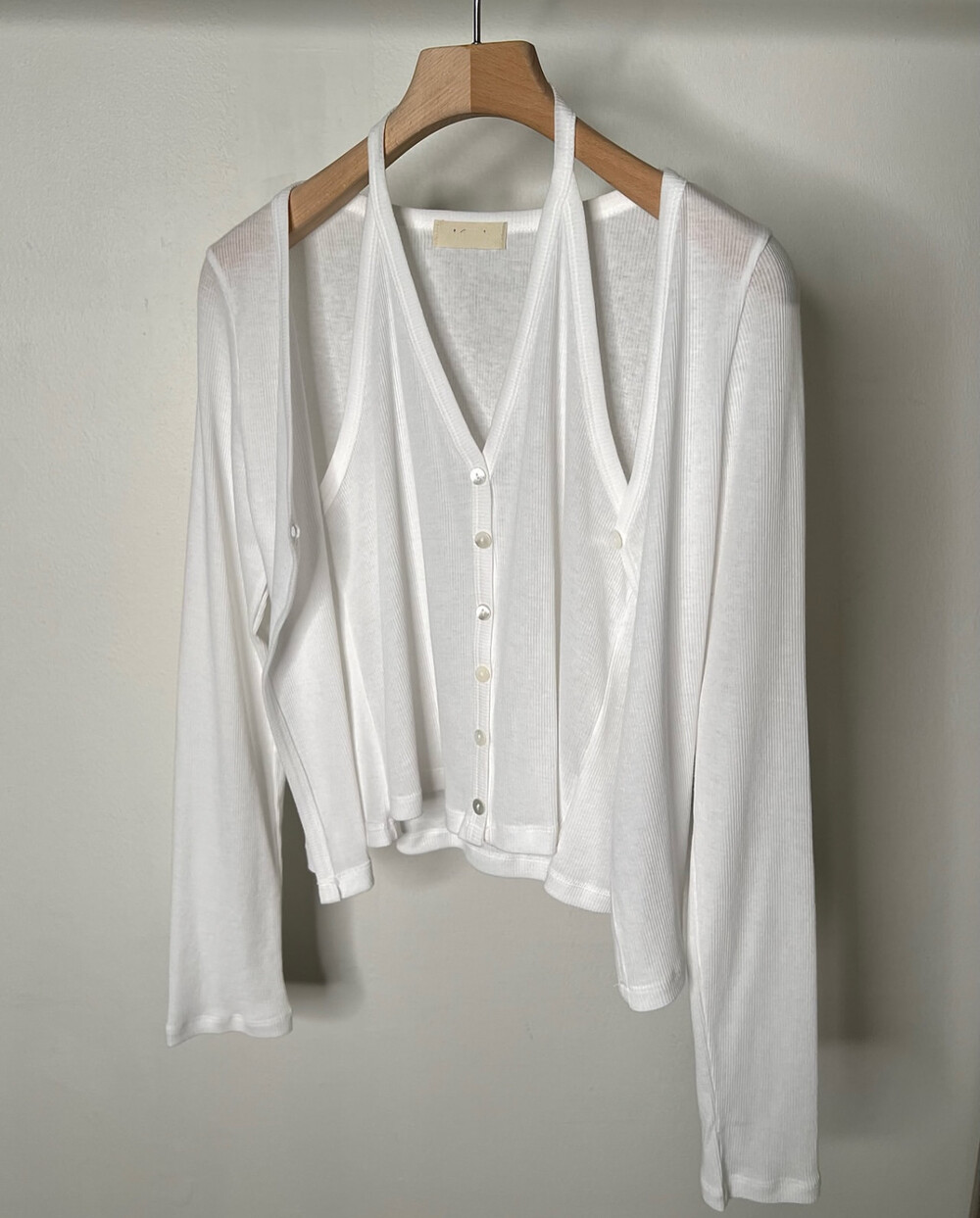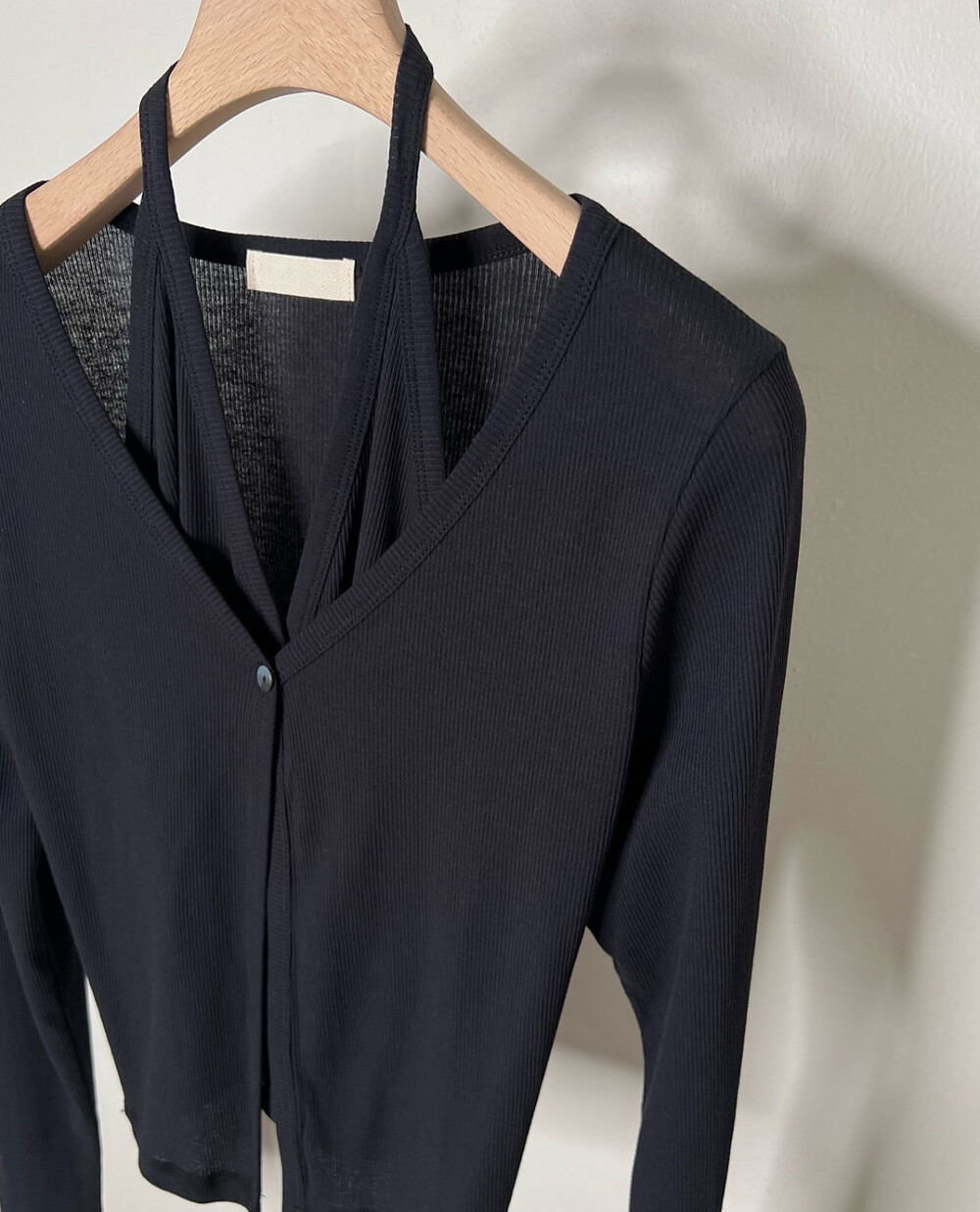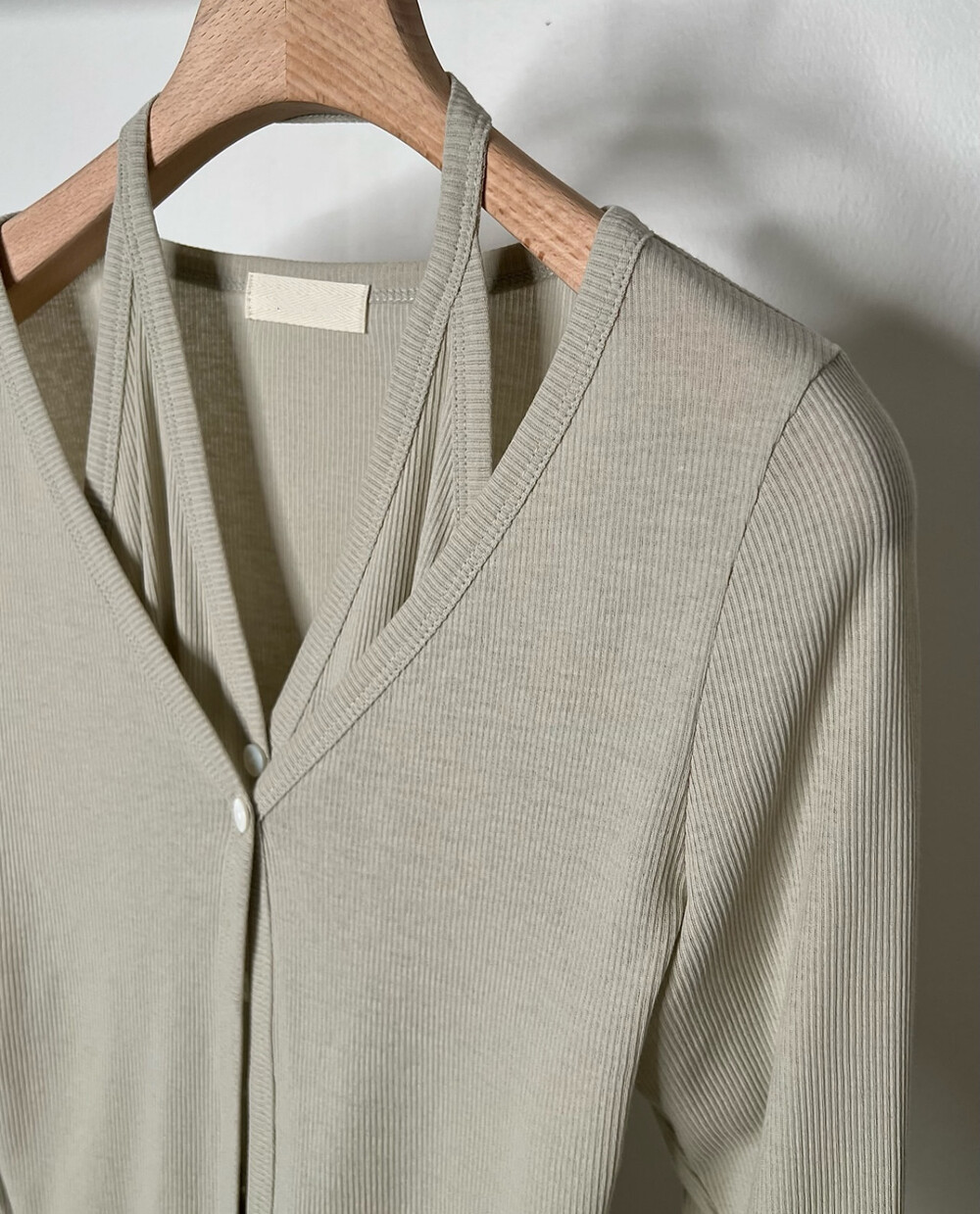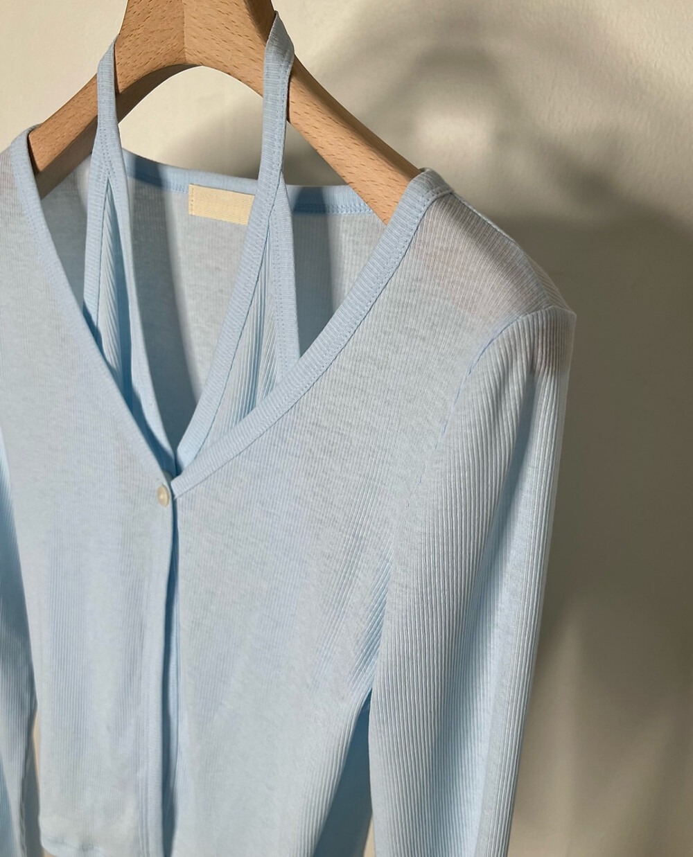 코튼 100의 소재이지만, 착용시 텁텁함이 없는 강연소재로 흐르는 핏이 굉장히 예쁘더라구요 *.* 그래서 덕분에 매우 슬림하게 만들어주기까지 하는 똑똑한 아이템이었어요! 얇은 소재라서 혹여 비침을 걱정하실 수도 있지만, 앞판이 두겹으로 레이어드 되어있어 비침이 거의 없다는 장점까지 갖추었답니다. 홀터탑과 가디건이 일체형으로 만들어져 여름내내 단품으로 착용하기에 좋은 아이템이랍니다! 간혹 급한 아침 출근시간이나 외출시에 이너와 아우터를 챙겨입기엔 조금 더울 것 같고 그렇다고 조금 신경써야할 때 고민없이 빠르게 해결할 수 있는 똑똑한 아이템이에요 ❤︎ 이너인 홀터탑의 단추는 장식용으로 오픈이 불가능하지만, 가디건의 단추는 오픈/클로징이 가능해 원하는대로 자유롭게 연출할 수 있어요!