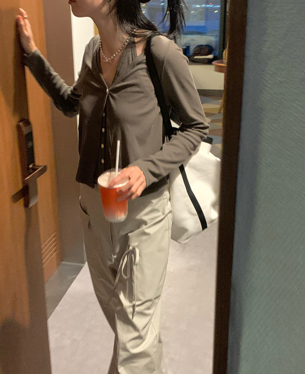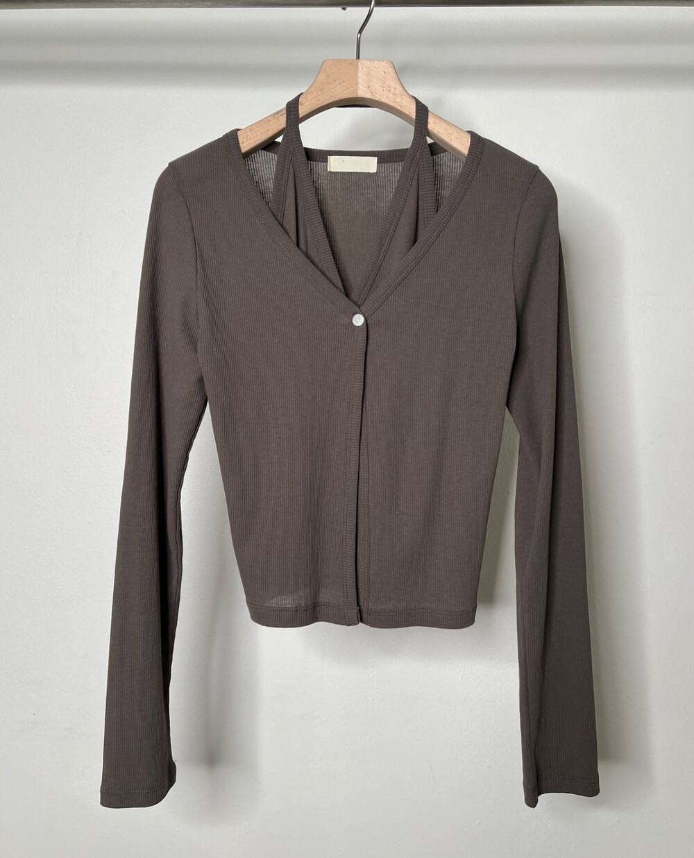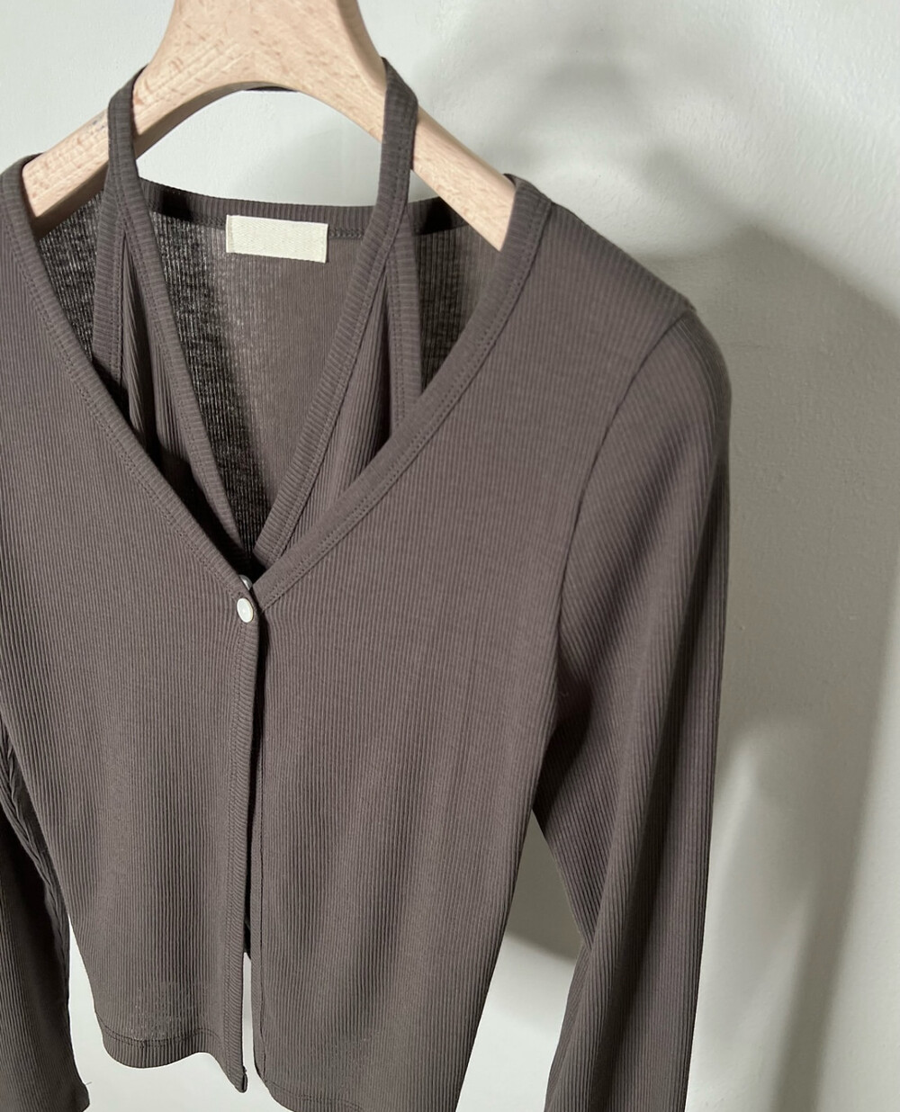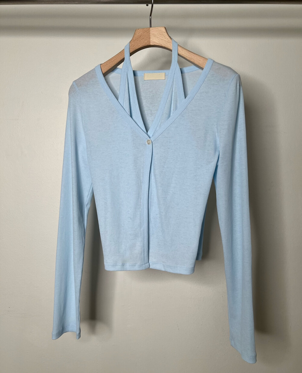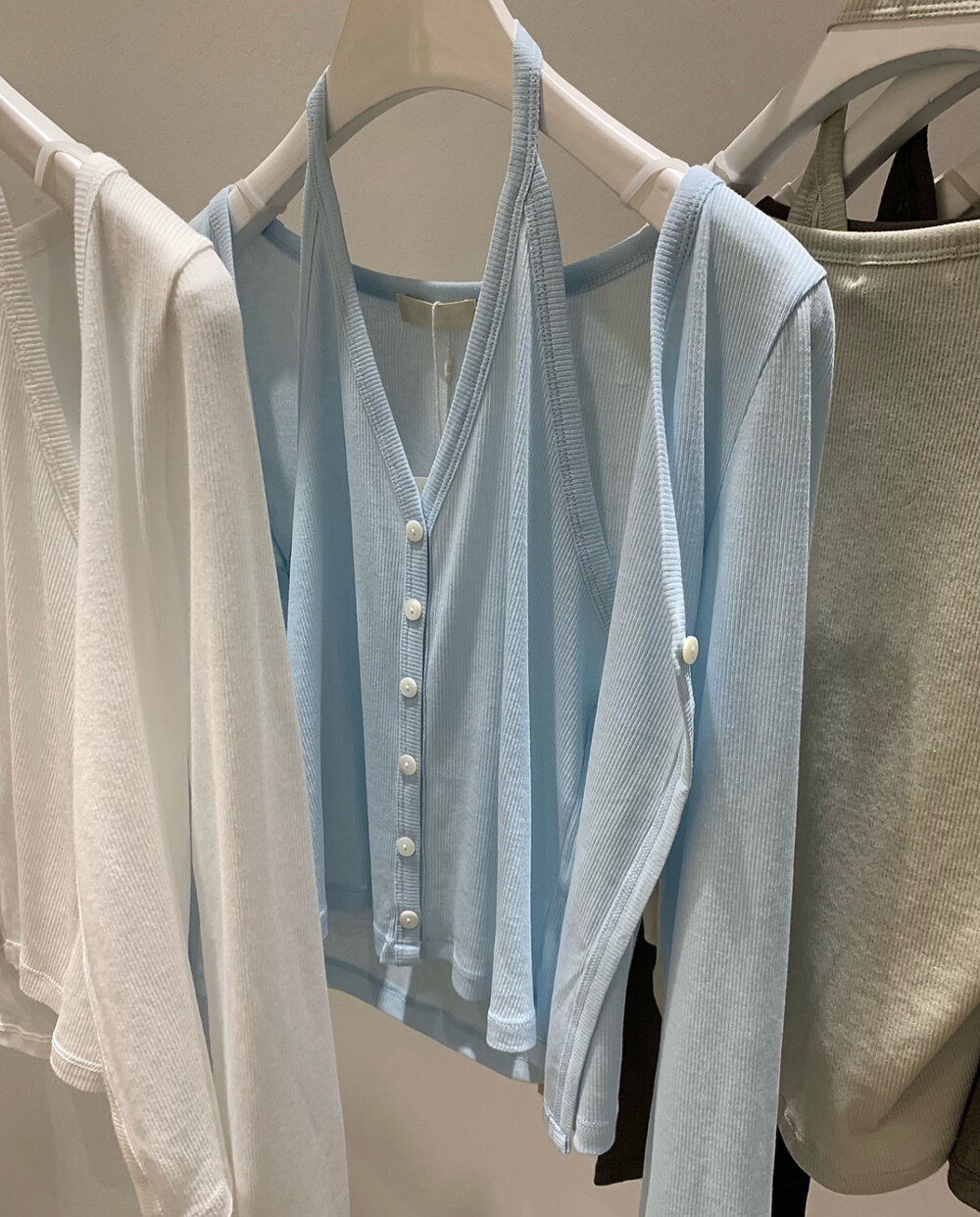 코튼 100의 소재이지만, 착용시 텁텁함이 없는 강연소재로 흐르는 핏이 굉장히 예쁘더라구요 *.* 그래서 덕분에 매우 슬림하게 만들어주기까지 하는 똑똑한 아이템이었어요! 얇은 소재라서 혹여 비침을 걱정하실 수도 있지만, 앞판이 두겹으로 레이어드 되어있어 비침이 거의 없다는 장점까지 갖추었답니다. 홀터탑과 가디건이 일체형으로 만들어져 여름내내 단품으로 착용하기에 좋은 아이템이랍니다! 간혹 급한 아침 출근시간이나 외출시에 이너와 아우터를 챙겨입기엔 조금 더울 것 같고 그렇다고 조금 신경써야할 때 고민없이 빠르게 해결할 수 있는 똑똑한 아이템이에요 ❤︎ 이너인 홀터탑의 단추는 장식용으로 오픈이 불가능하지만, 가디건의 단추는 오픈/클로징이 가능해 원하는대로 자유롭게 연출할 수 있어요!