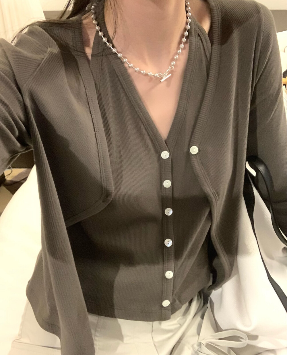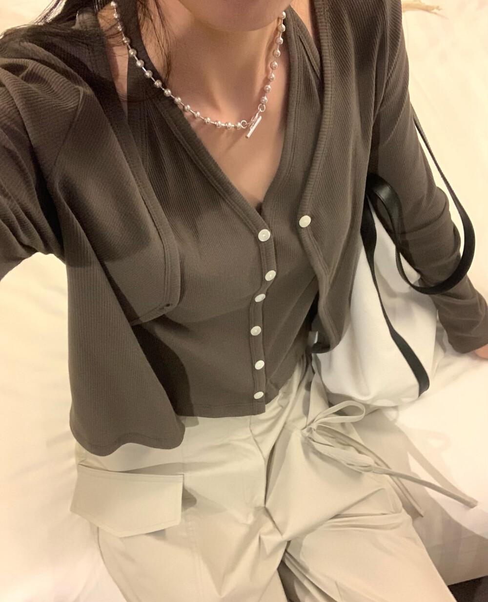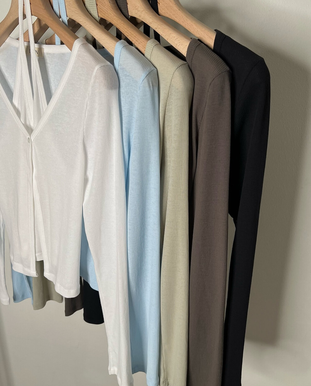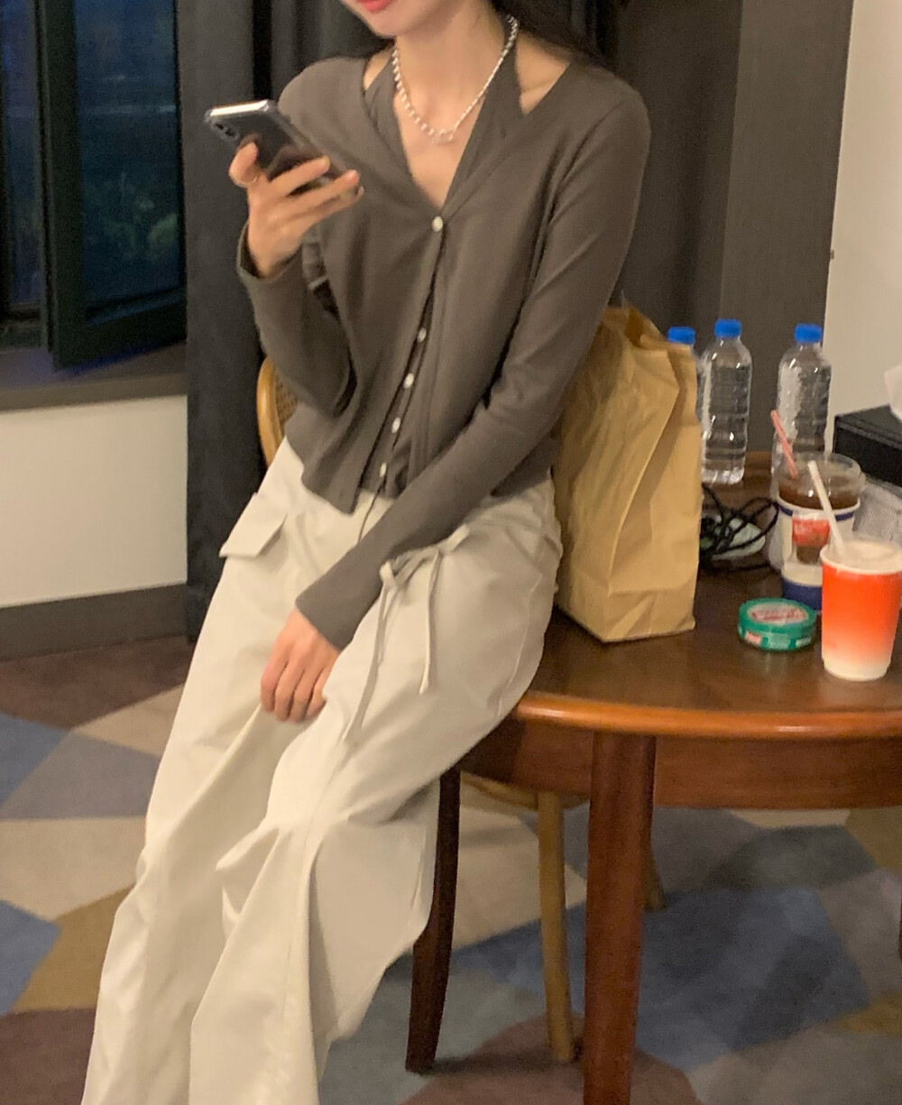 코튼 100의 소재이지만, 착용시 텁텁함이 없는 강연소재로 흐르는 핏이 굉장히 예쁘더라구요 *.* 그래서 덕분에 매우 슬림하게 만들어주기까지 하는 똑똑한 아이템이었어요! 얇은 소재라서 혹여 비침을 걱정하실 수도 있지만, 앞판이 두겹으로 레이어드 되어있어 비침이 거의 없다는 장점까지 갖추었답니다. 홀터탑과 가디건이 일체형으로 만들어져 여름내내 단품으로 착용하기에 좋은 아이템이랍니다! 간혹 급한 아침 출근시간이나 외출시에 이너와 아우터를 챙겨입기엔 조금 더울 것 같고 그렇다고 조금 신경써야할 때 고민없이 빠르게 해결할 수 있는 똑똑한 아이템이에요 ❤︎ 이너인 홀터탑의 단추는 장식용으로 오픈이 불가능하지만, 가디건의 단추는 오픈/클로징이 가능해 원하는대로 자유롭게 연출할 수 있어요!